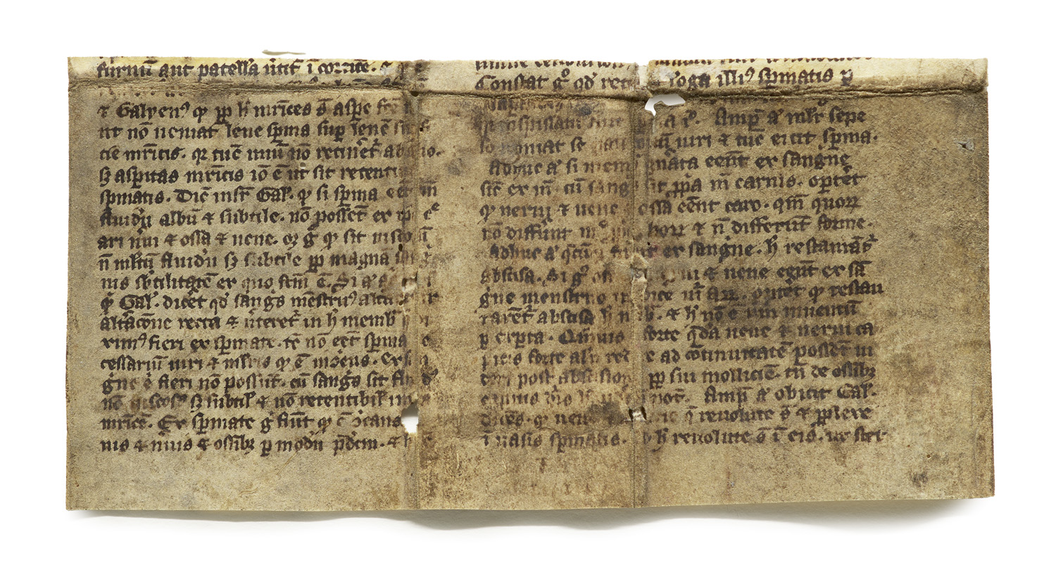 Fragment einer spätmittelalterlichen Handschrift. Aus der Pseudo Galen Tradition oder einem nah verwandten gynäkologischen Kompendium. 19 Zeilen. Lateinische Handschrift auf Pergament. Gotische Textualis. Schriftraum 9,1 x 17,6 cm,. Format: 10,6x 21, cm. Mitteleuropa, ca. zweite Hälfte 13. bis frühes 14. Jahrhundert (ca. 1270-1330).