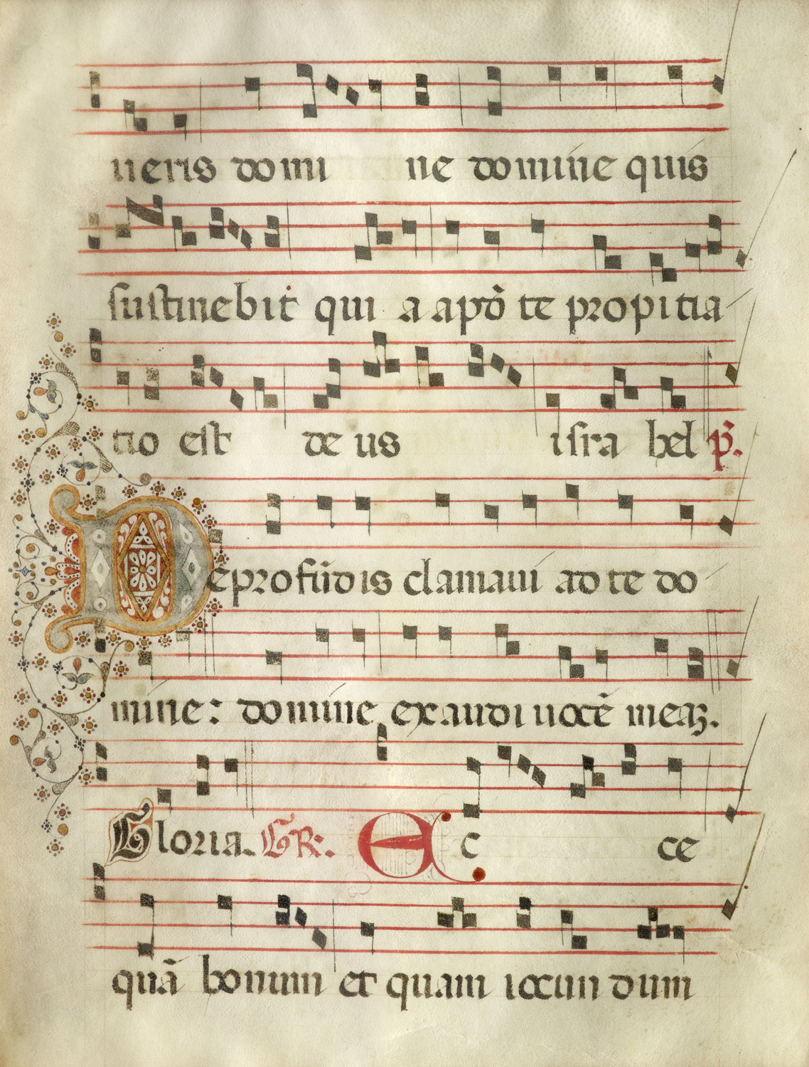 Manuskripte und Urkunden – Zur PALÄOGRAPHIE: Die kalligraphische Qualität mit penangulären Bögen (scharfe Winkel) und geraden Linien passt zu professionellen Skriptorien. Zu den paläographisch wichtigen Merkmalen gehören außerdem die zahlreichen Abkürzungen und Ligaturen. Kürzungsstriche über q oder über m und n zeigen ausgelassene Laute oder Silben an, hochgestellte Endungen wie -us oder -rum sind gängige Kanzleikonventionen der Zeit. Zum INHALT: Vierstrophige Neumen (quadratische Notenköpfe) deuten auf einen Choral oder Graduale hin, der Text könnte Psalm-ähnlich oder antifonal sein ("Nemo domini ne cum nic qui" - evtl. "Non nobis Domine" aus Ps 113, aber abweichend). Große Initiale "D" (vermutlich "Domine"), rote Inkunabeln und Blumenornamente sind dekorativ-liturgisch. Zur INITALE: Im Inneren des D liegen rauten- und mandelförmige Felder, die mit feinen Punkt- und Linienmustern dekoriert sind. Vom Buchstabenkörper gehen feine, schwungvolle Ranken aus, die den linken Seitenrand hinab- und hinauflaufen. An den Ranken sitzen kleine Blättchen und Blüten, teils in Rot und Blau akzentuiert, wie man es bei spätmittelalterlichen Buchmalereien häufig findet.