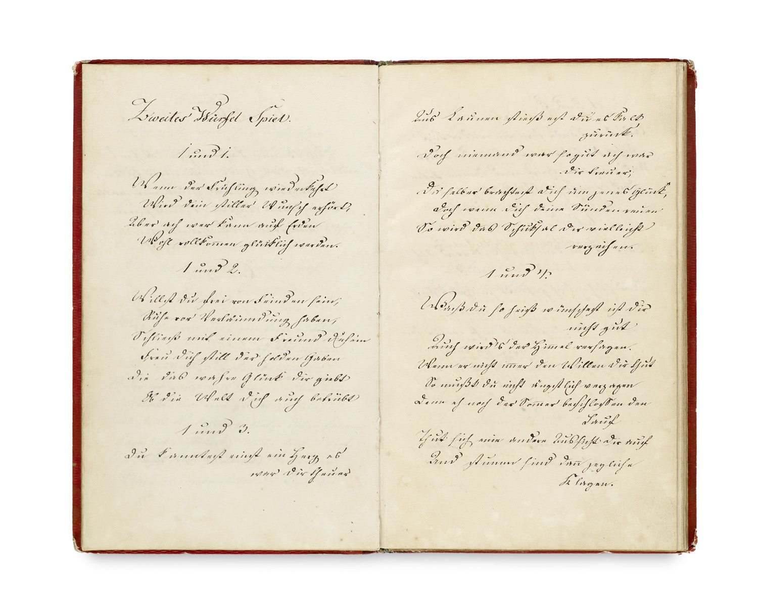 Manuscripts – Manuscript with instructions for a dice oracle game 'not for children, but only for educated adults' (trans.). Contemp. red leather binding with gilt edges, gilt border and dated monogram "Von RN. 1832" on the front cover (somewhat stained, bumped). - Ownership note by Alma Kunert and entry in memory of Margarete Scheele, dated Stolp 1887. - Somewhat browned and stained due to the paper, overall in good condition.