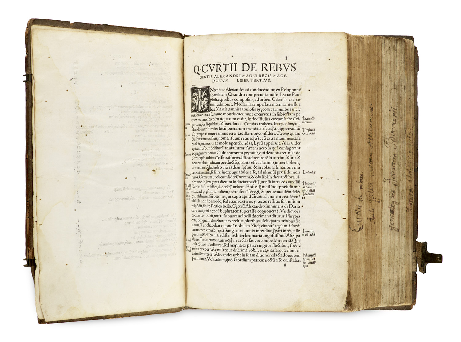 Alte Drucke, Bibeln, Klassische Autoren in den Originalsprachen – Enthält: 1. Curtius Rufus, Quintus, De Rebvs Gestis Alexandri Magni Regis Macedonvm. Cum Annotationibus Des. Erasmi Roterodami. Mit mehr. Holzschn.-Initialen. Argentorati (Straßburg), Schürer, 1518. Folio. 3 (von 4, ohne Titelbl.), LXXXIX Bl. - Erste Ausgabe mit den Annotationen von Erasmus von Rotterdam. - VD16 C 6462 - Adams 3119. - Bib. Erasmiana, Ser. 2, S. 23 - Eine der frühesten und einflussreichsten Renaissance Editionen des Alexanderwerks von Quintus Curtius Rufus. - Teils leicht fleckig, wenige Annotationen von alter Hand, gelegentlich etwas wasserrandig, fehlt Titel, leichte Wurmspuren im Außenrand. - 2. Aulus Gellius, Auli Gellii noctium Atticarum libri vndeuiginti. Titelbl. mit eingefaßter Holzschn.-Bordüre. Argentinae (Straßburg), Schürer bei Johannes Knobloch, 1517. 10 Bll., 105 S., 13, 14 Bll. - Früher, postinkunabl. Druck. - VD 16, G 1035 - Adams G 345 - Muller II, 134, 188 - Mit mehr. handschriftlichen Annotationen von alter Hand. - 3. - Boccaccio, Giovanni, Genealogiae Joannis Boccatii, cum demonstrationibus in formis arborum designatis. Mit Titelblatt in Rot und Schwarz und Holzschn-Vignette vom Heil. Bartholomeus, 13 ganzs. Genealogischen Holzschn.-Tabellen unhd zahlr. Holzschn.-Initialen. Venedig, Zani, 1511. 162 Bll. - Erster (parallel zur Pariser Ausgabe) Postinkunabeldruck von Boccaccios Genealogie der heidnischen Götter. - Essling 801 - Sander 1079 - Adams 2172 - Fast zweihundert Jahre lang war das Werk der umfassendste Leitfaden zur heidnischen Mythologie, der verfügbar war, besonders durch die Holzschnitt-Stammbäume nach denen, die Boccaccio für sein Originalmanuskript in Auftrag gegeben hatte. - Wenige Bll. Etwas braunfleckig, insgesamt gutes Exemplar. - 4. Homer, Odyssea de Erroribus Ulyxis. Übers. von Franc. Griffolini. Argentoraci (Straßburg), Schottus (gedruckt für Gregorius Maxillus Uebelin), 1510. LI Bll. - Eine der frühesten gedruckten Fassungen der Odyssee in humanistischer Übersetzung. - VD16 H 4701 - Hoffmann II, 336 - Adams H 796 - Durchgehend mit Annotationen von alter Hand. Gelegentlich etwas braunfleckig, teils am Ober- und Unterrand feuchtigkeitsrandig, kleine Wurmlöchlein, letzte 2 Bll. mit größ. Wurmspur am Oberrand mit jeweils 1 Buchstabenverlust. Zusammen gebunden in Halbschweinslederband d. Zt. auf Holzdeckel mit 1 (von 2) Schließen und auf 4 Bünden. Fleckig und beschabt, kleine Wurmspuren.