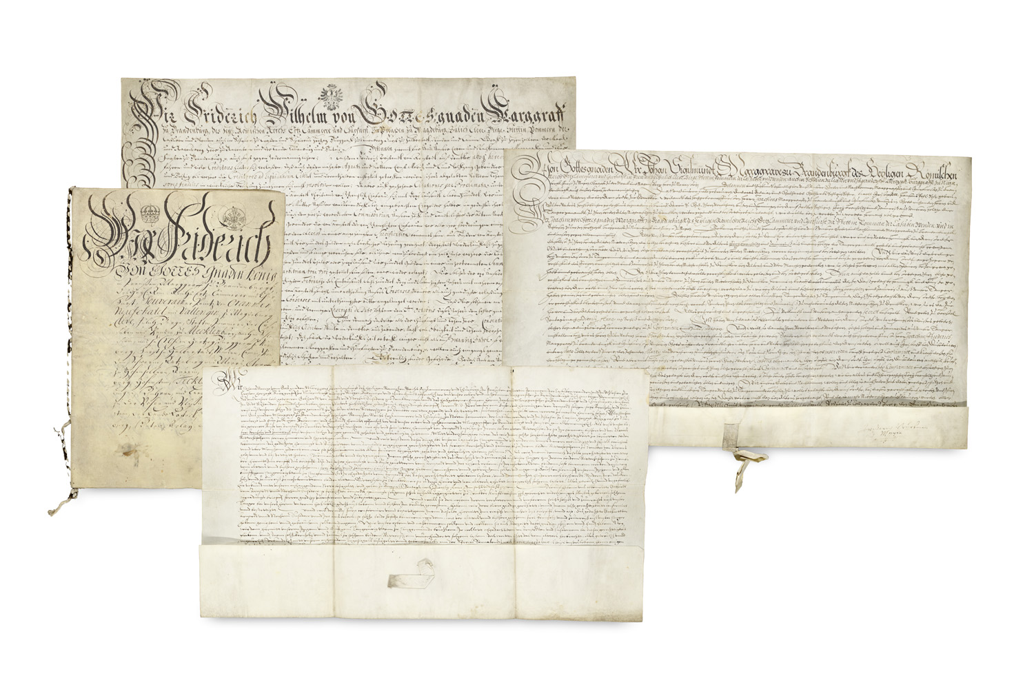 Manuscripts – Saxony-Anhalt - Collection of four letters of enfeoffment on parchment for the von Arnstedt family concerning the manor houses at Demker (Tangerhütte). Each without its original seal. - In the name of King Frederick, Elector Frederick William of Brandenburg, Elector John Sigismund of Brandenburg, Margrave Johann Georg of Brandenburg. - With signatures by diplomat Marquard Ludwig Freiherr von Printzen (1675-1825), feudal secretary Johann Bergius, cabinet secretary Paul von Fuchs and the feudal secretary Daniel Stephani. - Foldmarks, partly dusty and stained, 1 small wormhole, overall well preserved.