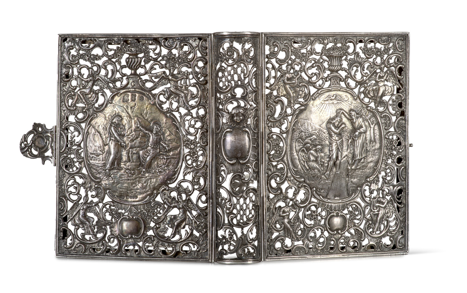 Books on Books, History of Paper and Typography – Silver book cover - - An intricately crafted, filigree book cover featuring embossed reliefs and ornaments. It depicts biblical scenes: John the Baptist pointing to Christ and the Baptism of Christ in the Jordan. Surrounding tendrils, flowers, cherubs, and musical motifs frame the scenes, typical of Baroque and Rococo silversmithing. Marked with silver and hallmark on both wings. 26 x 15.6 cm (when opened). Probably South German (likely Augsburg or Nuremberg) Rococo silverwork, circa 1730-1750. The combination of openwork rocaille scrollwork, vases of fruit and flowers, cherubs, and angels playing music corresponds exactly to the repertoire of South German Rococo silversmiths, as documented, for example, in Augsburg.