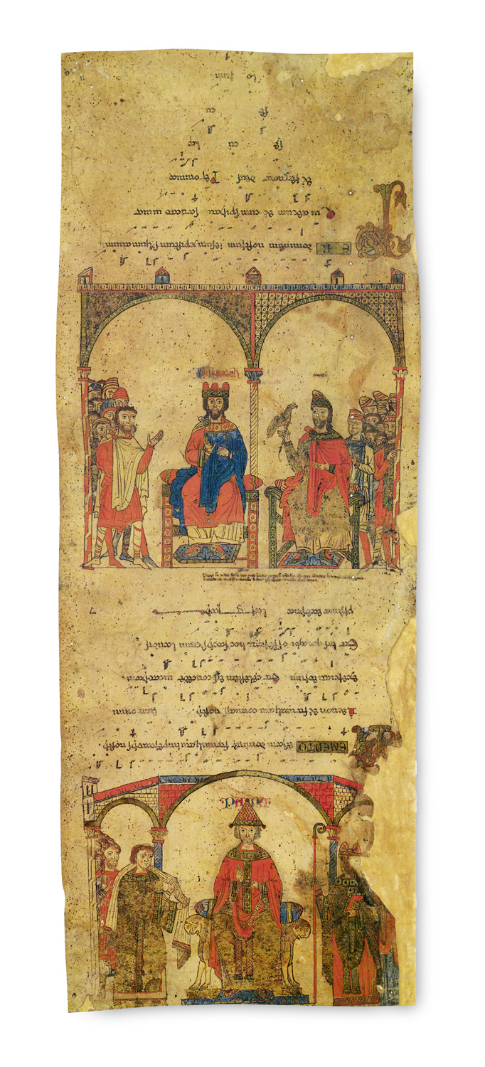 Die Exulte-Rolle. Faksimile des Codex Barberini latinus 592 der Biblioteca Apostolica Vaticana. Faksimileblätter und Kommentar. Zürich, Belser Verlag, 1988. 5 Bll. Lose zusammen mit Lwd. mit goldgepr Titel in Lwd. Kassette mit mont. Illustration (berieben und bestoßen, leicht fleckig, Kommentarfach innen lose).