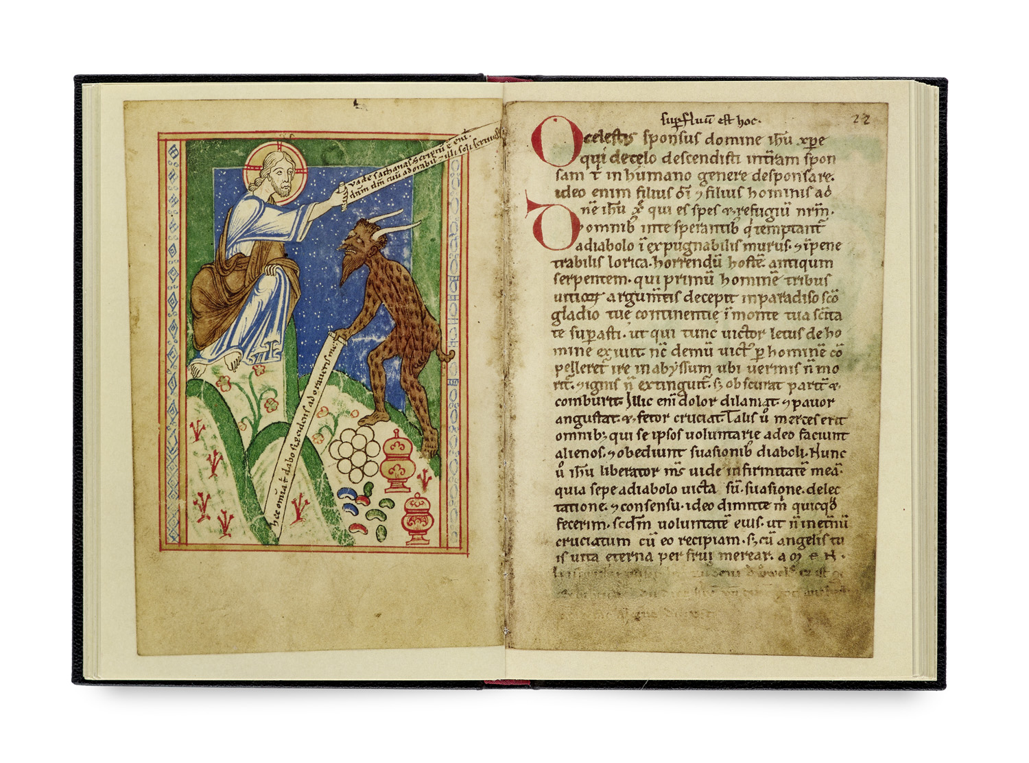 Books on Books - Facsimile Editions – Facsimile of Codex Latinus Monacensis 935 in the Bavarian State Library. 2 vols. Facsimile and commentary. Leather binding in cardboard slipcase and half-leather binding (commentary) with red-tooled titles. - The 72 illuminations of the Hildegard Prayer Book depict Old Testament as well as New Testament scenes. This prayer book, which originated in the Middle Rhine region in the late 12th century, is distinguished not only by its numerous illustrations, but also by the personal prayer book of the abbess, writer, composer, philosopher, mystic, visionary, and botanist Hildegard of Bingen in her final years. - Mint condition.