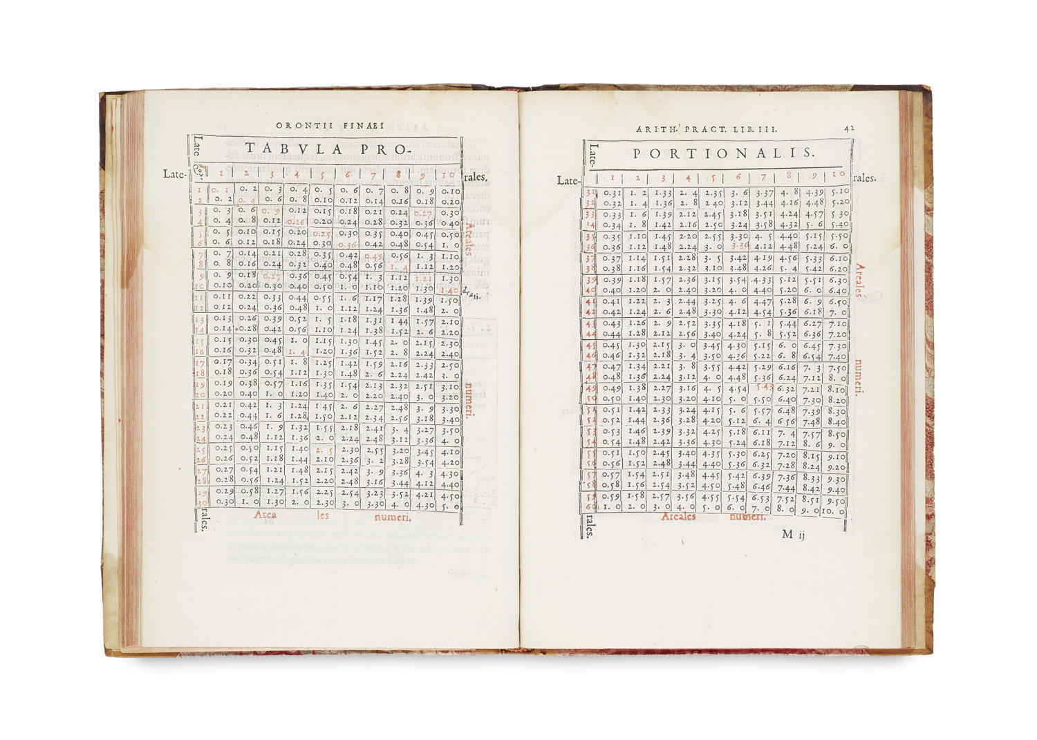 Prints before 1600, Bibles, Classics in Original Languages – Fourth edition of Finé's Arithmetic. - For references see above. - Edition published posthumously by Oronce Finé's (1494-1555), the prominent French mathematician and professor at the Collège Royal, son Jean. The work is divided into four chapters, covering integrals, ordinary fractions, sexagesimal fractions, and proportions. - Provenance: "South Library" of the Earls of Macclesfield at Shirburn Castle, with their lithographed bookplate using the family coat of arms, as well as owner's inscriptions on and around it. - The book-block is heavily water-stained in the upper third, pastedowns and endpapers have glue stains in the corners, the first front endpaper is loose, otherwise a solid copy of this early and important mathematical treatise.