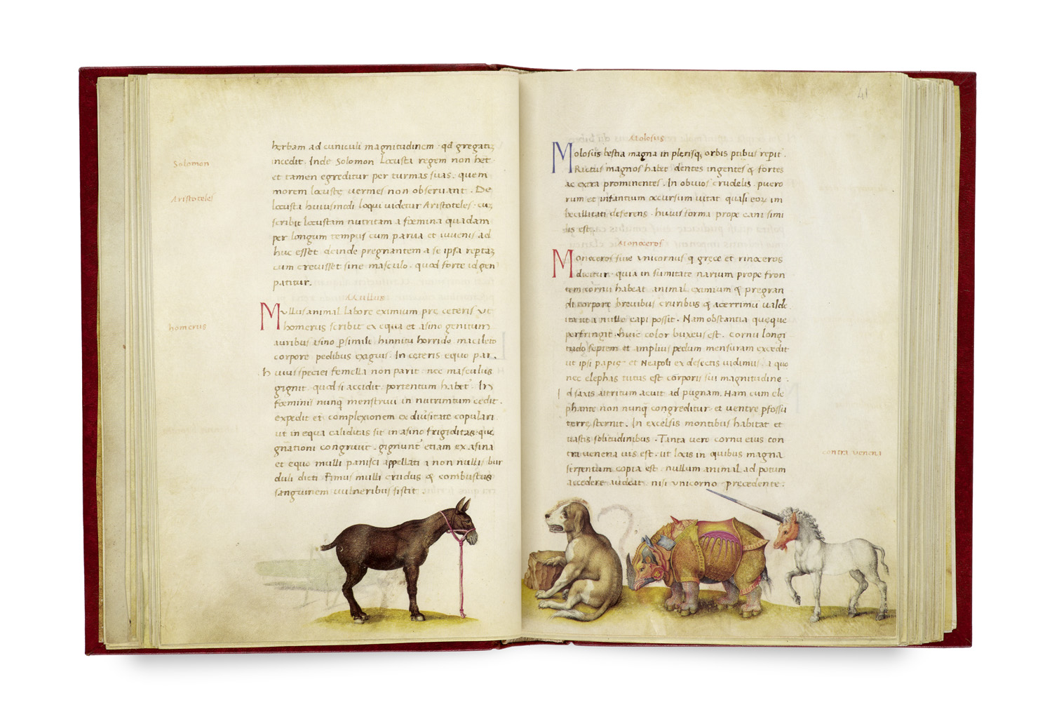 Books on Books - Facsimile Editions – Facsimile of the Codex urbinas latinus 276 from the Biblioteca Apostolica Vaticana. 2 vols. (Facsimile and commentary). With numerous color miniatures. Gilt-embossed red orig. leather and canvas with gilt spine title. - One of 2400 Arabic numbered copies (total ed. 2460). - Originally the work was created around 1460 in Italy for Lodovico Gonzaga. In 1515 it was enriched with magnificent, colorful and gold embellished illustrations. The animal book of Candidus is one of the most beautiful and at the same time most important natural science book illustrations of the 15th century. Included are illustrations of 450 partly exotic animal species such as rhinos, felines but also mythical creatures such as phoenixes and unicorns are depicted. - Near mint copy.