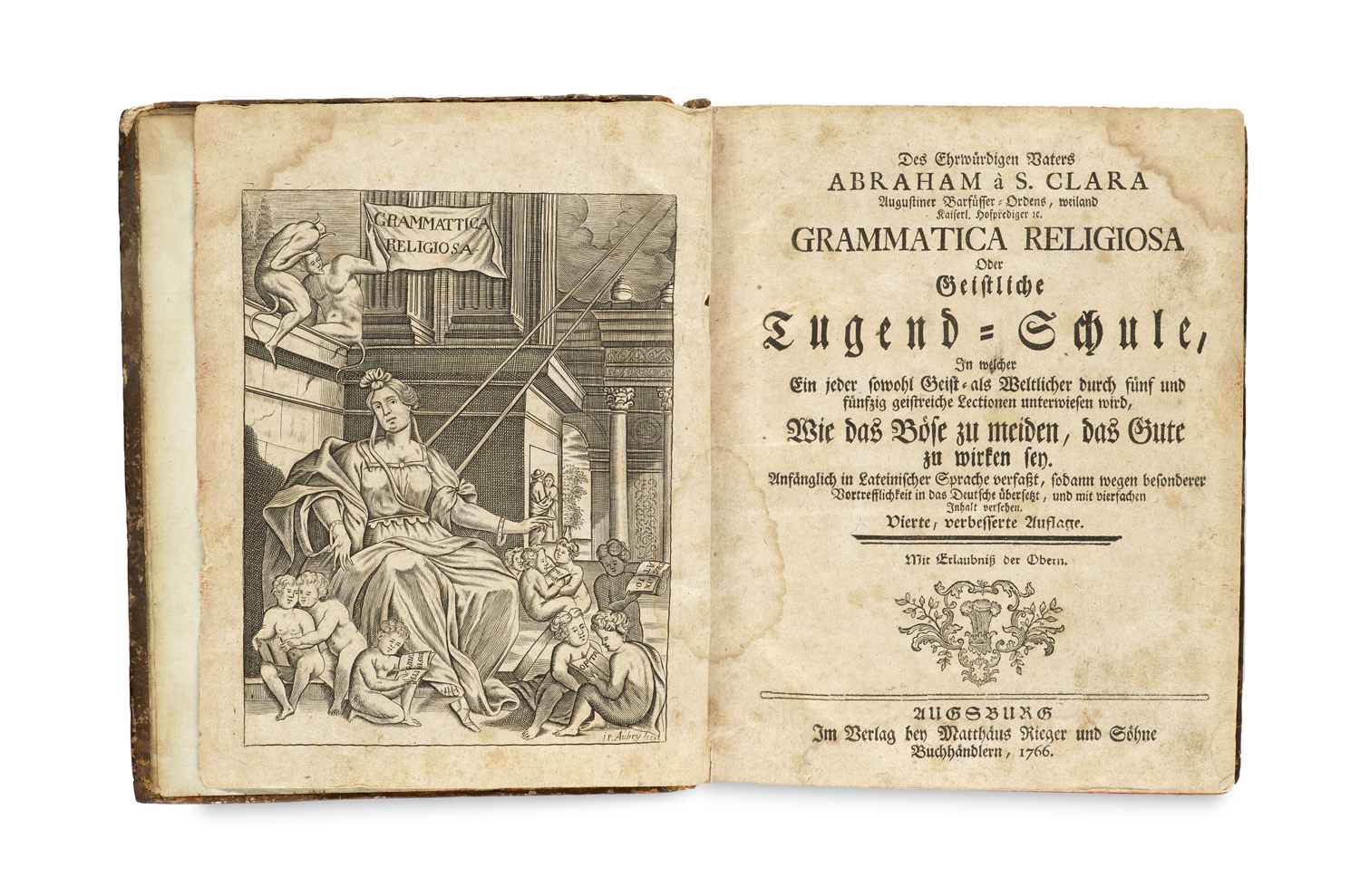 Grammatica Religiosa oder Geistliche Tugend-Schule, in welcher ein jeder sowohl Geist- als auch Weltlicher durch fünf und fünfzig geistreiche Lectionen unterwiesen wird, Wie das Böse zu meiden, das Gute zu wirken sey. 4. verbesserte Aufl. Mit 1 gestoch. Frontispiz von J.P. Aubry. Augsburg, Rieger, 1766. 11 Bll., 740 (recte 704) S., 12 Bll. Gr.-8°. HLdr. d. Zt. (Gelenke berieben, Kanten bestoßen).