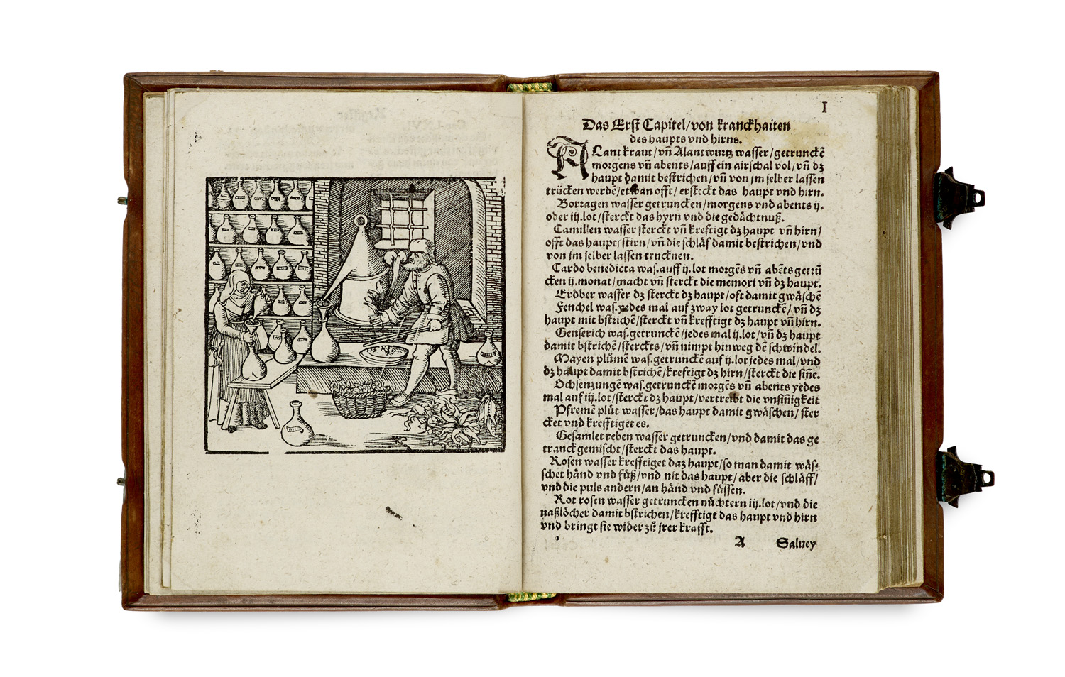 Wie mann alle gebresten unnd kranckheyten des menschlichen leybs, außwenndig unnd ynnwendig, von dem Haupt an, biß auff die Füß, artzneyen und vertreyben soll, mit außgebranten Wassern ... Newlich zusamen gesetzt unnd gezogen. (Augspurg, Getruckt durch Hainrich Stainer, 1547) (8), LXXIII Bll. 4° Einband im zeittypischen blindgeprägten Kalbleder über Holzdeckeln, mit einem Holzschnitt-Titelschild und einem wiederholten Holzschnitt am Ende des Registers.