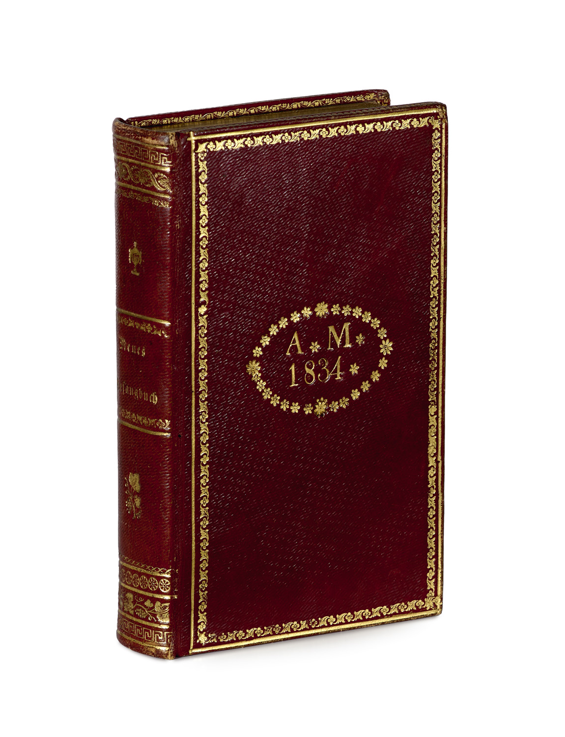 Literatur des 17. bis 19. Jahrhunderts – Mit Etikett der Bücherei Fr. Kuhles. - Gesangbuch mit über 530 Lieder in einem prachtvollen Einband. - Nachgebunden: Sammlung von Gebeten zur Unterhaltung der Andacht für die Evangelisch-Badischen Lande. Pforzheim, Geiger und Katz, 1830. 72 S. - Ränder leicht gebräunt. Leicht stockfleckig. Insgesamt gut erhalten.