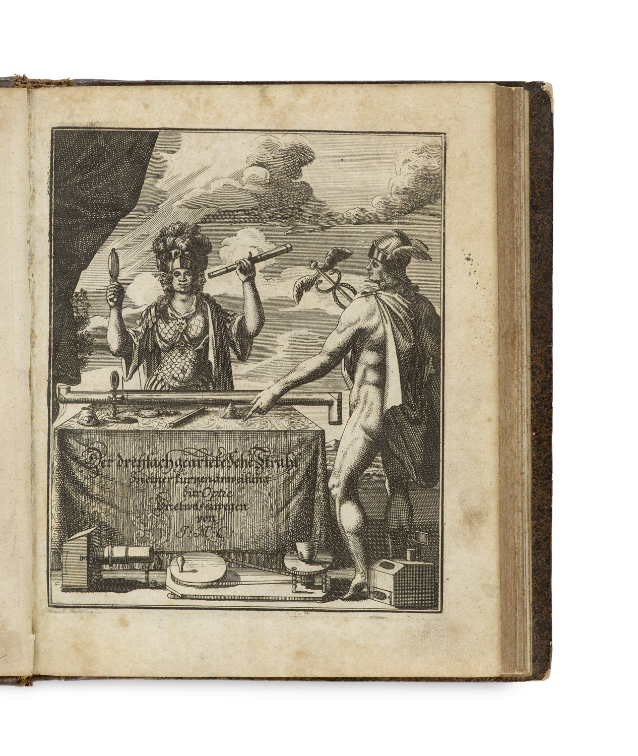 Der dreyfach geartete Sehe-Strahl. In einer kurtzen doch deutlichen Anweisung zur Optica. Mit gestochenem, zusätzlich radiertem allegorischen Kupfertitel und 24 Kupfertafeln. Thurnau, Regelein für den Autor in Coburg, 1710. 9 Bl. (Gestoch. u. gedr. Tit., Widm., Vorw.), 119 (1) S. Kl.-4°. HLdr. d. Zt. mit RTit. auf Ldr.-Schild, die Decken mit Sprenkelpapier bezogen (Gelenke stw. geplatzt, berieben, Kanten bestoßen).