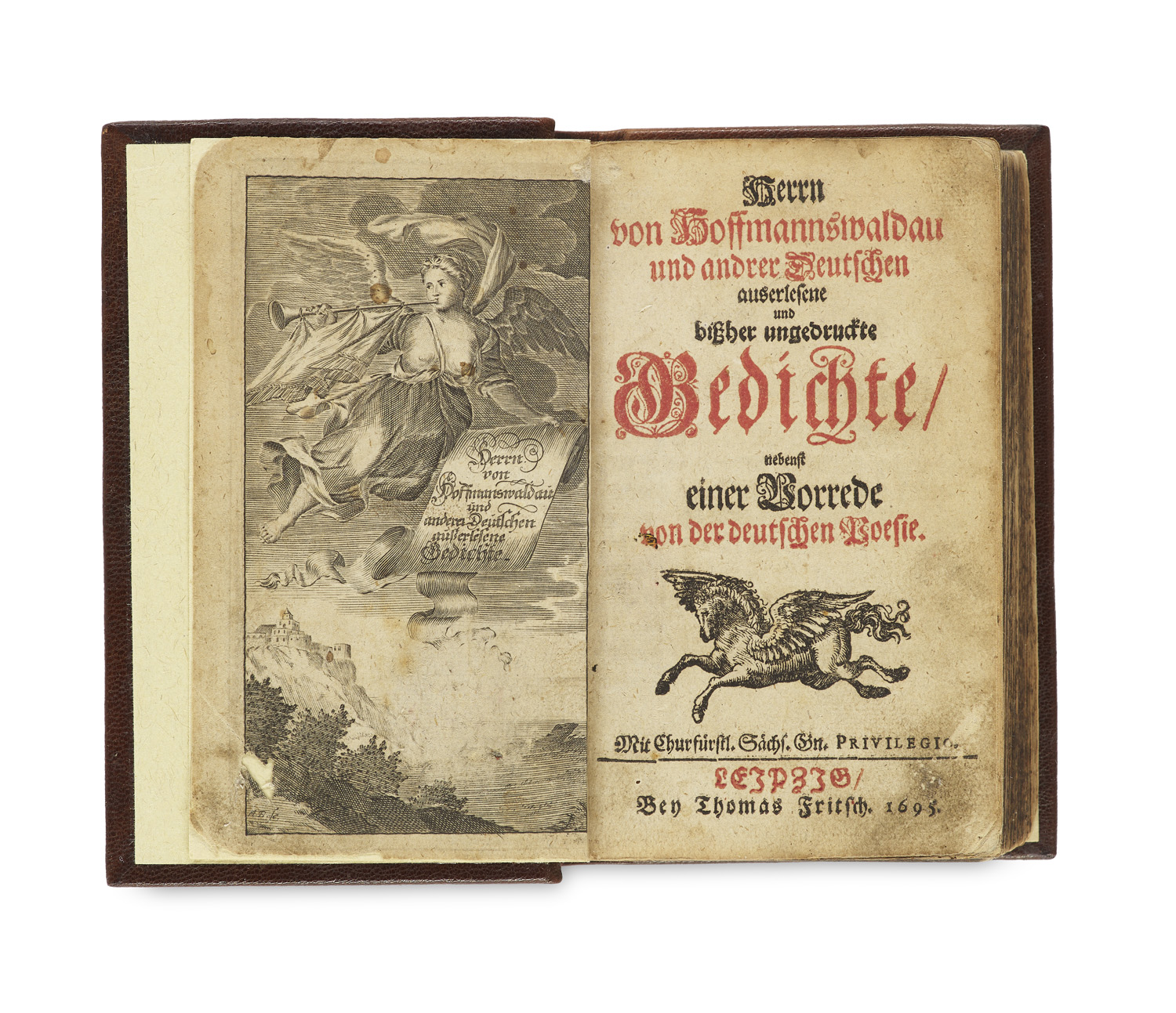 Herrn von Hoffmannswaldau und andrer Deutschen auserlesener und bisher ungedruckter Gedichte, nebenst einer Vorrede von der deutschen Poesie. - Angebunden dasselbe: Anderer Theil. - Angebunden dasselbe: Dritter Theil. Mit einem gestochenen Frontispiz, einer gestochenen Titelvignette und mehreren Vignetten im Text. Leipzig, Thomas Fritsch, 1695 ff. Titel in Rot und Schwarz, 20 Bll.(Widmung, Vorrede und Register), 420 Seiten - Titel in Rot und Schwarz, 7 Bll. (Register), 362 Seiten - Titel in Rot und Schwarz, 360 Seiten, 1 Bl. (Register). Kl.-8°. Brauner Lederband des frühen 20. Jahrhunderts über drei Bünden.
