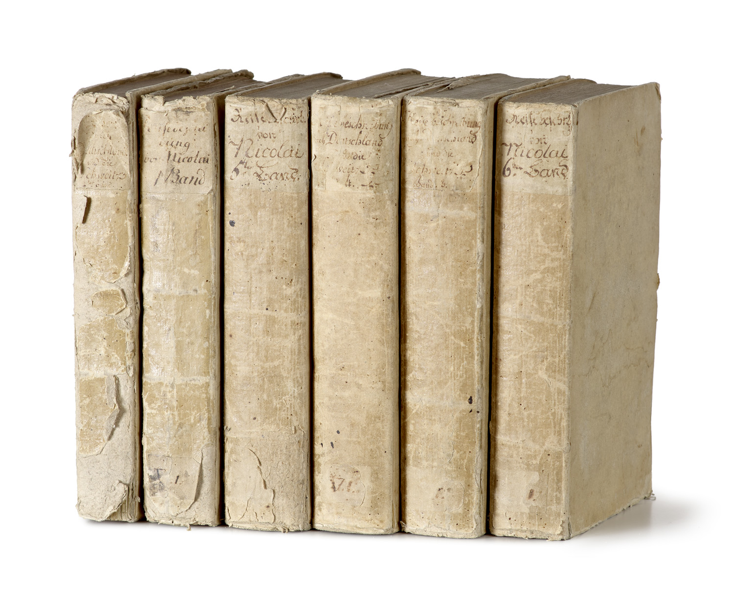 Literatur des 17. bis 19. Jahrhunderts – Erste Ausgabe. - Raabe 327. - Becker 162 ff. - Goedeke IV, 1, 502, 21. - Hayn-Gotendorf VIII, 479. - Engelmann 433. - Vorliegend die ersten 6 von insgesamt 12 Bänden von Friedrich Nicolais kritischem Reisebericht, der Kontroversen auslöste, nichtsdestoweniger aber eine wahre Fundgrube zu Kultur- u. Technikgeschichte, Statistik, Architektur, Wirtschaft u. Bevölkerung der von ihm bereisten Gebiete darstellt. - Provenienz: Alle Titelbl. mit gestempeltem Exlibris "H. Werner". - Durchgehend leicht gebräunt und mitunter leicht stockfleckig, sonst gut erhaltener Exemplarsatz des auch in Einzelbänden nicht häufigen Werks.