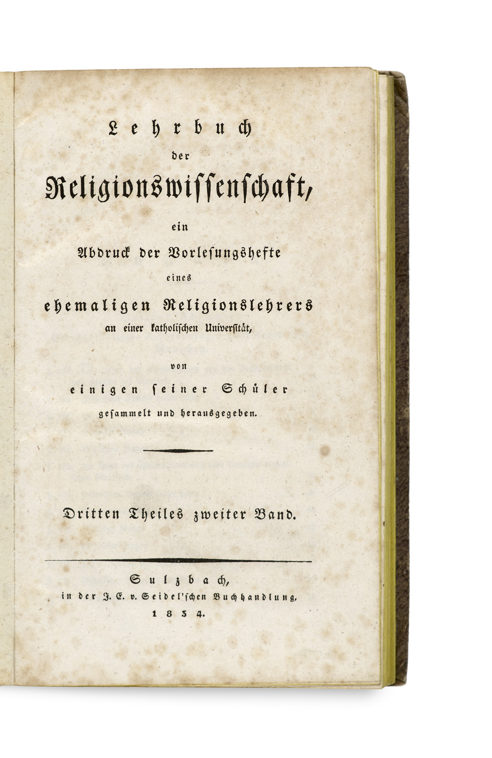 Lehrbuch der Religionswissenschaft, ein Abdruck der Vorlesungshefte eines ehemaligen Religionslehrers an einer katholischen Universität. 3 Teile in 4 Bänden. Sulzbach, Seidel, 1834. 8°. Ppbde. d. Zt. mit RSchd. (etwas fleckig u. beschabt).