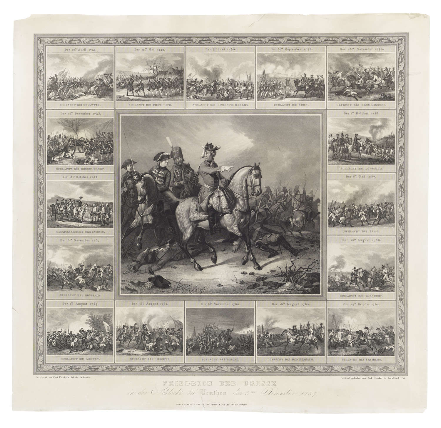 Geschichtswissenschaften – Enthält: Carl Friedrich Schulz. Friedrich der Grosse in der Schlacht bei Leuthen den 5ten Dezember 1757. Ca. 1850. Stahlstich auf Velin. 49,5 x 52 cm. - Zentrale Abbildung von Friedrich dem Großen zu Pferde, umgeben von 16 kleineren Abbildungen weiterer preußischer Schlachten je mit Datum und Betitelung. Darunter Die Schlachten bei Prag, Rossbach, Lowositz, Liegnitz und Torgau. - Leichte Randläusren. Kleiner Einriss am unteren Rand. Minimal fleckig. Insgesamt gut erhalten. - Iserlohner Tabakdose aus Messing und Kupfer. 16 x 5 x 4 cm. - Mit Portraits und Widmung für Friedrich den Großen auf dem Deckel sowie den Schlachten auf dem Boden der Dose. Darunter tls. die selben Schlachten, wie auch im Stahlstich. - Leichte Patina. Motive berieben. Insgesamt gut erhalten.