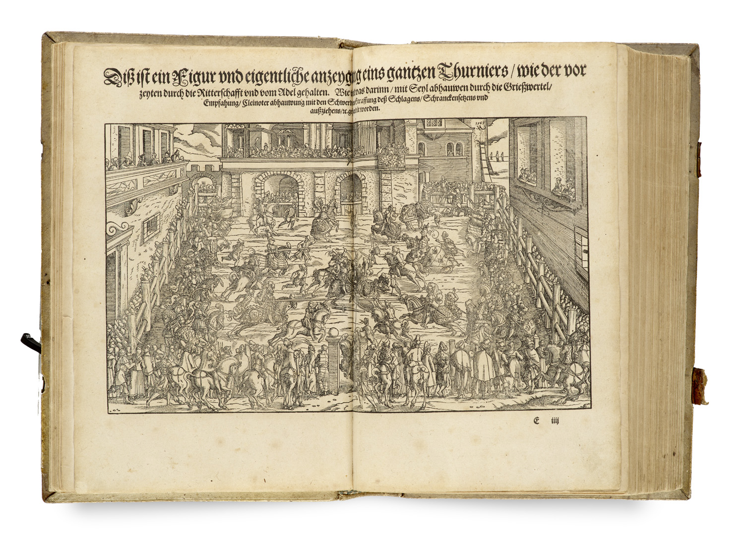 Thurnier-Buch. Von Anfang, Ursachen, ursprung, und herkommen der Thurnier im heyligen Römischen Reich Teutscher Nation (...) Alles jetzunder von neuwem zusammen getragen mit schönen neuwen Figuren sonderlich auch der Adelischen Wappen auffs schönest zugericht (...) 2 Teile i. e. Band. Mit 1 großen Titelholzschnitt, 2 doppelblattgroßen Holzschnitten, 120, meist großen und teils wiederholten Holzschnitten im Text, zahlreichen Wappen-Holzschnitten im Text und 1 Holzschnitt-Druckermarke. Frankfurt a.M., G. Raben für S. Feyerabend und S. Hüter, 1566. 6 nn. Bl. (Tit., Vorw., Widm.), CCXLII Bl., 3 nn. Bl. (Reg.) und 4 nn. Bl. (Tit., Vor.), LXXXI Bl. 4°. Dt. Schweinsldr. der Renaissance auf vier erhabenen Bünden über Holzdecken, der Rücken in fünf Fächern mit hs. RTit. im ersten Fach, die Decken in Blindprägung mit drei dreifachen Streicheisenrahmen, wovon zwei ausgerollt mit Porträtmedaillons bzw. Rankenwerk in Palmettendekor, der dritte als Mittelfeld ebenso gestaltet mit Platte im Mittelstück, sowie zwei Messingschließen (Schließenbänder fehlen, kleinen Bezugsfehlstellen, fleckig, etw. beschabt).
