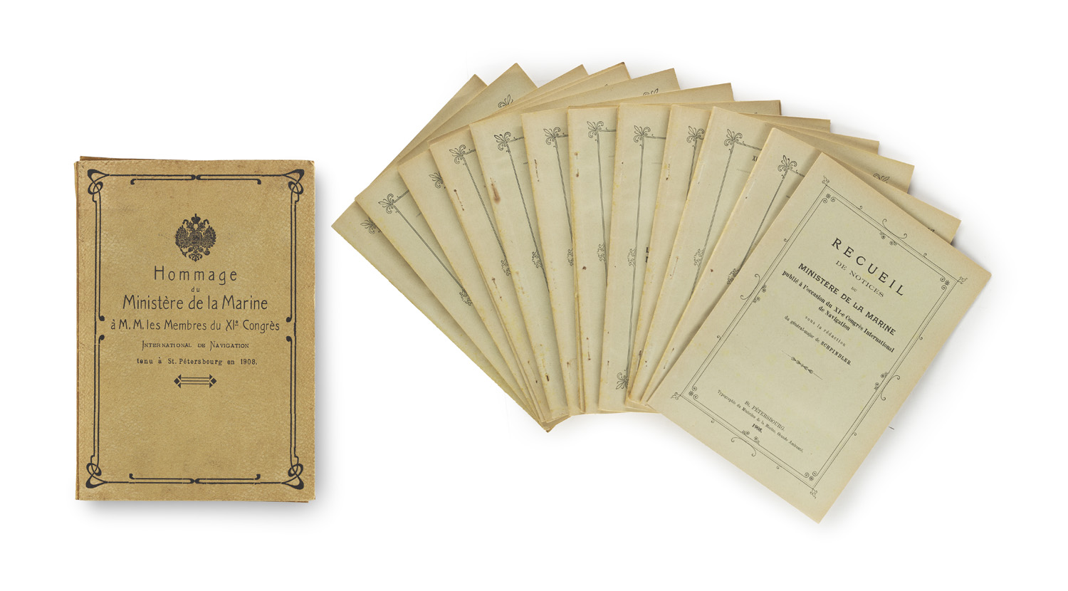 Hommage du Ministère de la Marine à M.M. les Membres du XI° Congrès International de Navigation tenu. St. Petersbourg, Typographie du Ministère de la Marine, 1908. Gr.-8°. Broschur in HLwd. Mappe mit schwarzgepr. DTitel (leicht fleckig, berieben).