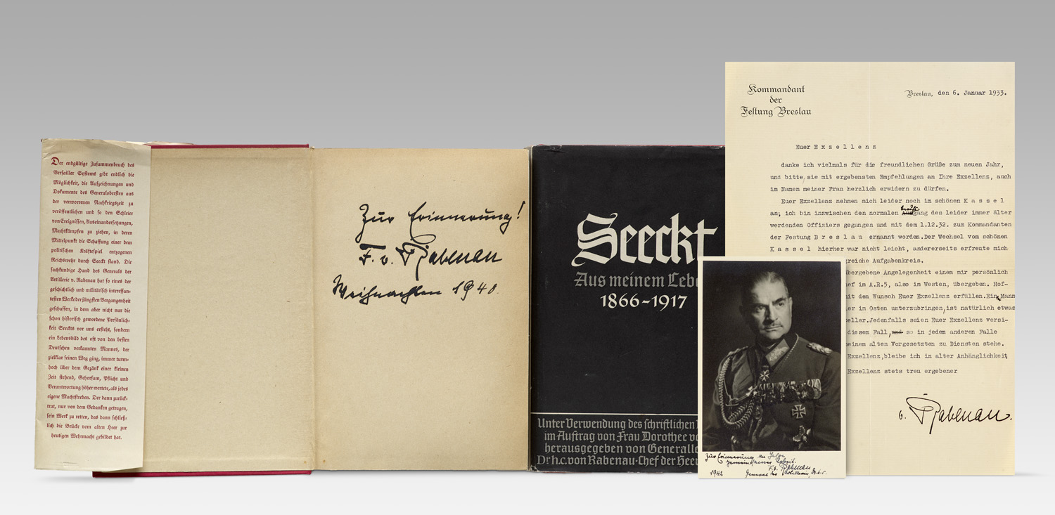 History – Resitance. - Contains: Hans von Seeckt. From My Life. 1866-1917 and 1918-1936. 2 vols. Each with a handwritten dedication by Friedrich von Rabenau dated 1940. Leipzig, Hase & Koehler, 1938-1940. 8°. Hardback with original dust jacket (Cover heavily rubbed and bumped). - Signed photograph of Rabenau. 1942. 16 x 10.5 cm. - Letter from Rabenau, as commander of the Breslau Fortress, to Lieutenant General (ret.) von der Lippe. - Von Rabenau was a German theologian and officer. During his time as head of the Army Archives, he attempted to recruit senior Wehrmacht commanders to the resistance and was eventually arrested in 1944 as a co-conspirator in the plot against Hitler. He was subsequently sent to various concentration camps and ultimately murdered on 14 or 15 April on the express orders of Heinrich Himmler. - In good overall condition.