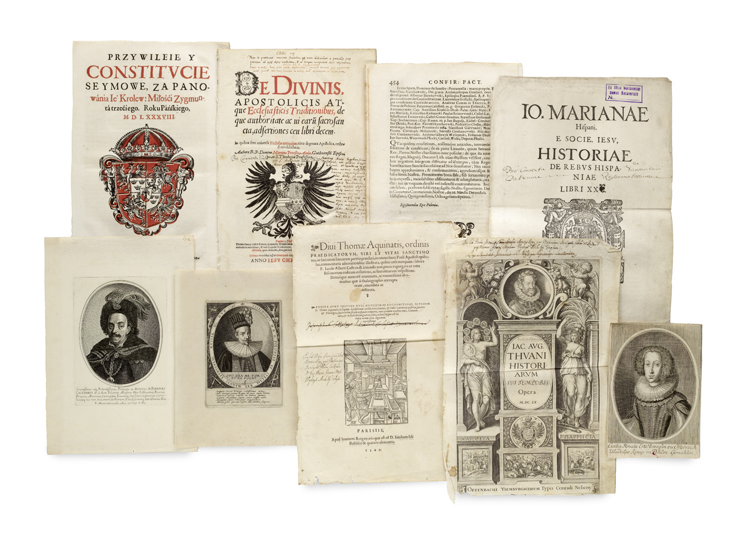 History – Poland - Collection of 23 title pages, some in red and black, mostly with woodcut vignettes, and excerpts from books, some from Poland, in Polish or relating to Polish history, as well as 3 copperplate portraits. 16th/17th century. - Includes, among others: Iac. Aug. Thuani Historiarum ... Opera. 1609. Engraved title page with contemp. handwritten inscription "Ex Museo Joannis ... Wydzga" (i.e., Johann Stephan Wydzga, 1610-1685, Archbishop of Gniezno and Primate of Poland). - Diui Thomae Aquinatis, ordinis praedicatorum, viri et vitae sanctimonia ... 1549. Title page with inscription as above. - Io. Marianae Hispani. 1592. Tit. with "Exlibris Marianorum domus Bielaneris". - Thesaurus polonolatinograecus ... 1648. Tit. with note from the Camaldolese Order, 8 sheets, pp. 3-12. - And as listed above. - The portraits show: Cecilia Renata of Austria (married Queen of Poland), Sigismund III Vasa and John II Casimir. - Partly trimmed, a few leaves slightly foxed, creased and with minor damage, overall well preserved.