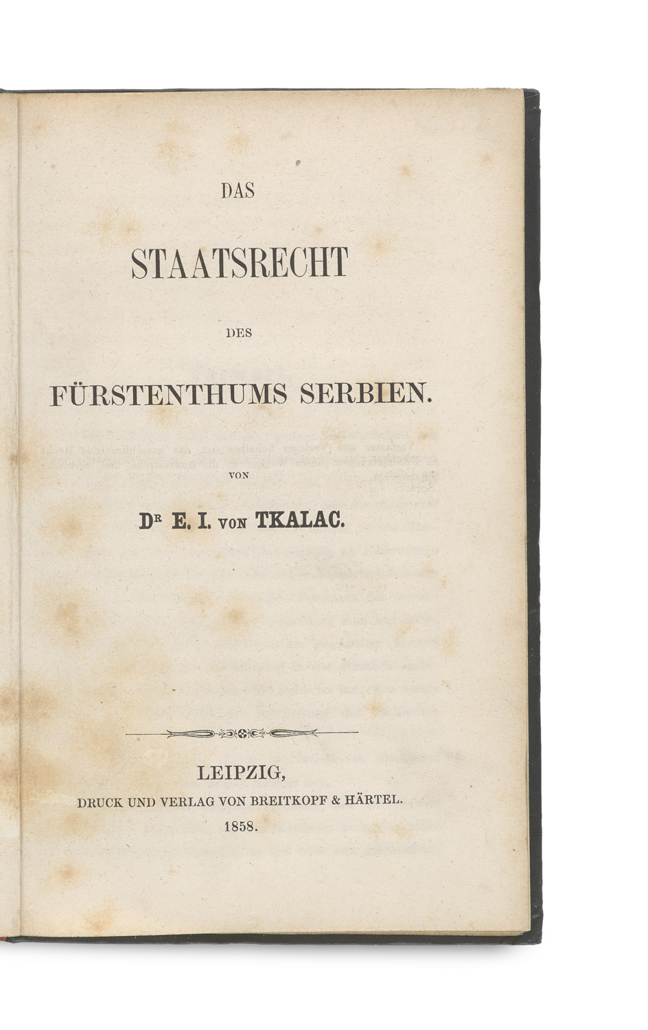Geschichtswissenschaften – Erste Ausgabe dieser frühen Abhandlung über das Verfassungsrecht des Fürstentums Serbien. - Biographisches Lexikon zur Geschichte Südosteuropas. Bd. 4 (1981), S. 331ff. - Emmerich von Tkalac (auch Imbro Ignjatijevic Tkalec, 1824-1912) war ein kroatischer Gelehrter. Als Publizist und politischer Aktivist vertrat er insbesondere die national- und kulturpolitischen Interessen der österreichischen Slawen. Vorliegende Darstellung umfasst "das gesammte Staatsrecht Serbiens soweit es auf positiven Gesetzen und anerkannten Rechtsherkommen beruht." (Vorwort) Es enthält zudem urkundliche Beilagen, die erstmals und teils aus den griechischen und türkischen Originalen übersetzt der (deutschsprachigen) Öffentlichkeit zugänglich gemacht wurden. Provenienz: Datierter Besitzereintrag "Dr. L. Neumann 1858" auf dem Vorsatzblatt recto. - Stellenweise leicht stockfleckig, sonst sauberes Exemplar dieses für uns derzeit im Handel nicht und historisch auf Auktionen nur ein Mal nachweisbaren Rarums.
