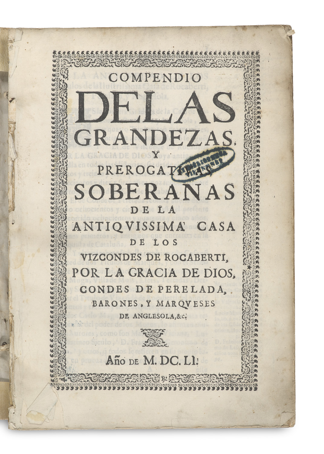 Compendio de las grandezas y prerogativas soberanas de la antiquissima casa de los Vizcondes de Rocaberti ... Condes de Perelada ... O.O. (Madrid) u. Dr., 1651. 72 Bl. Sign. 1 nn Bl. (Titelbl.), A-R2, Aa-Ss2. 2°. Flex. Pgmt. d. Zt. auf drei durchgezogenen Bünden mit kalligr. RTit. (etwas fleckig, berieben, mit Knickspuren).