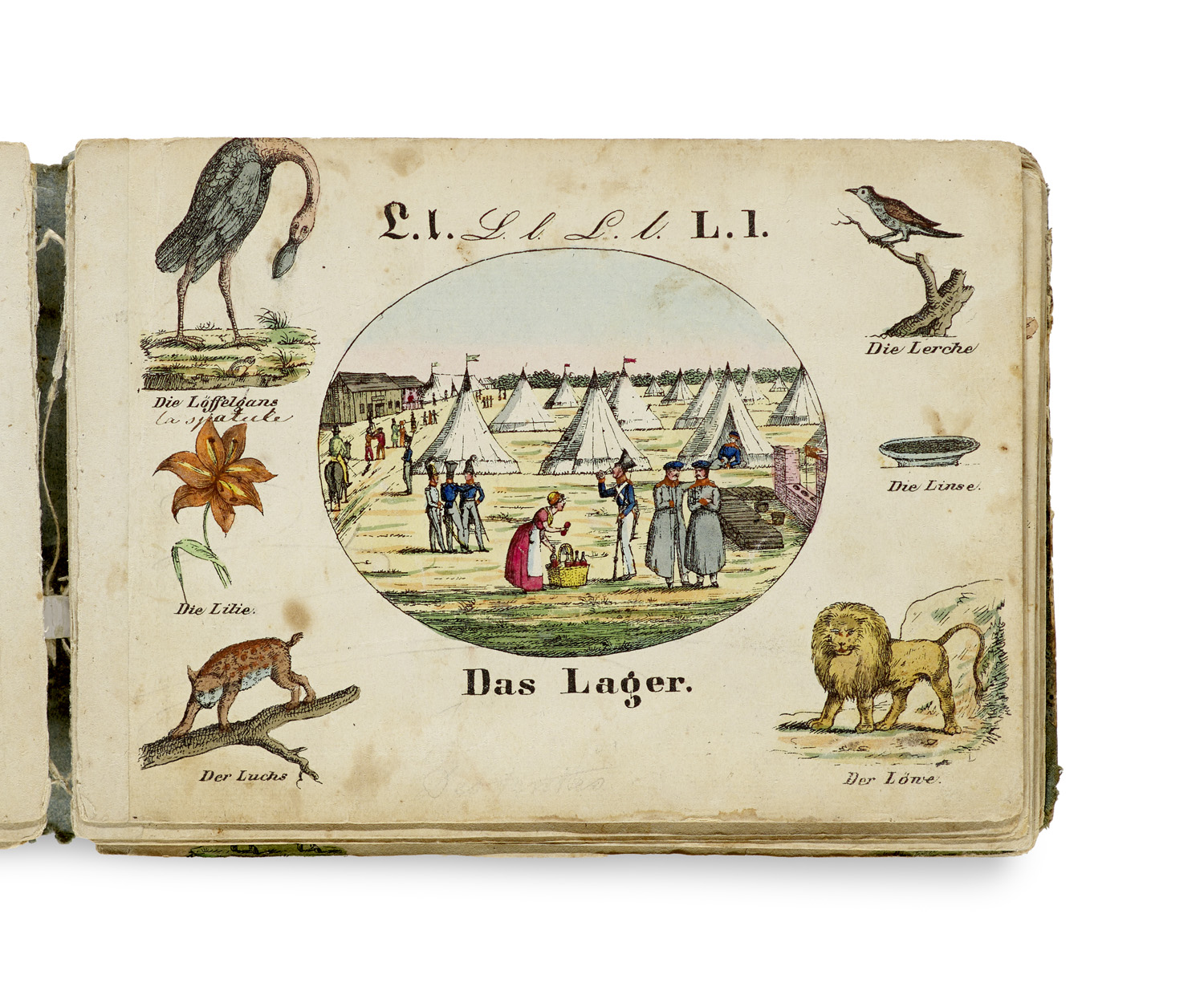 Childrens Books – Very rare primer, with 20 (of 26) strinking hand-coloured lithographed plates after pen and ink drawings. Bound in 19th half-cloth with marbled boards. - Each plate features a large illustration in the center representing the respective letter (e.g., "Bauernhof" for B, "Ziegenheerde" for Z) and is framed by six smaller illustrations depicting plants, animals, fruits, etc. The meticulously detailed illustrations are hand-colored in mostly vibrant coloures. - Missing the plates for the letters A, I, U, W, X, and Y. - The binding is largely loose, the plates are consistently browned, and there are foxing, finger marks, and dirt stains throughout. Despite these flaws, the book is nonetheless collectible due to the rarity of complete colour lithograph picture books from this period.