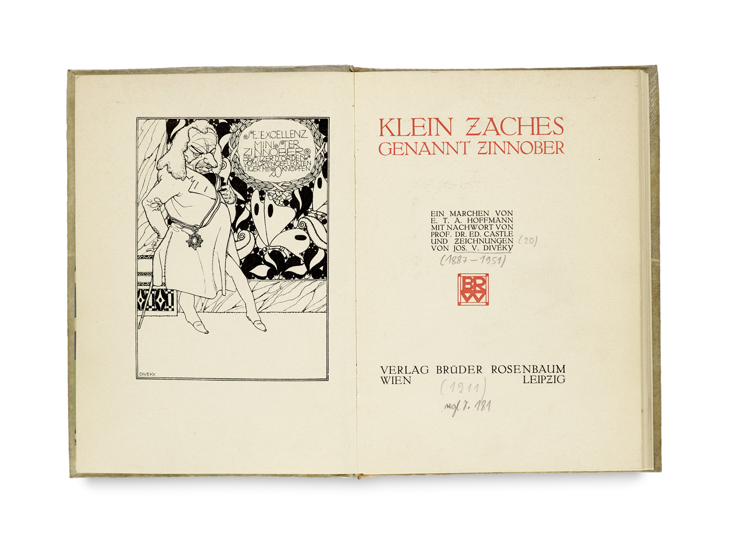 Klein Zaches genannt Zinnober. Ein Märchen. Mit 20 Illustrationen auf Tafeln, Vignetten und Buchschmuck von Joszef von Diveky. Wien und Leipzig, Rosenbaum, 1911. 205 S. 18 x 12,5 cm. Original-Ganzpergamentband (Wiener Werkstatte, nicht signiert) mit goldgeprägtem Ruckentitel, goldgepragter Deckelvignette und farbigen Vorsatzen (angeschmutzt, aufgebogen, Innengelenke angebrochen, Innendeckelbezuge etwas wellig).