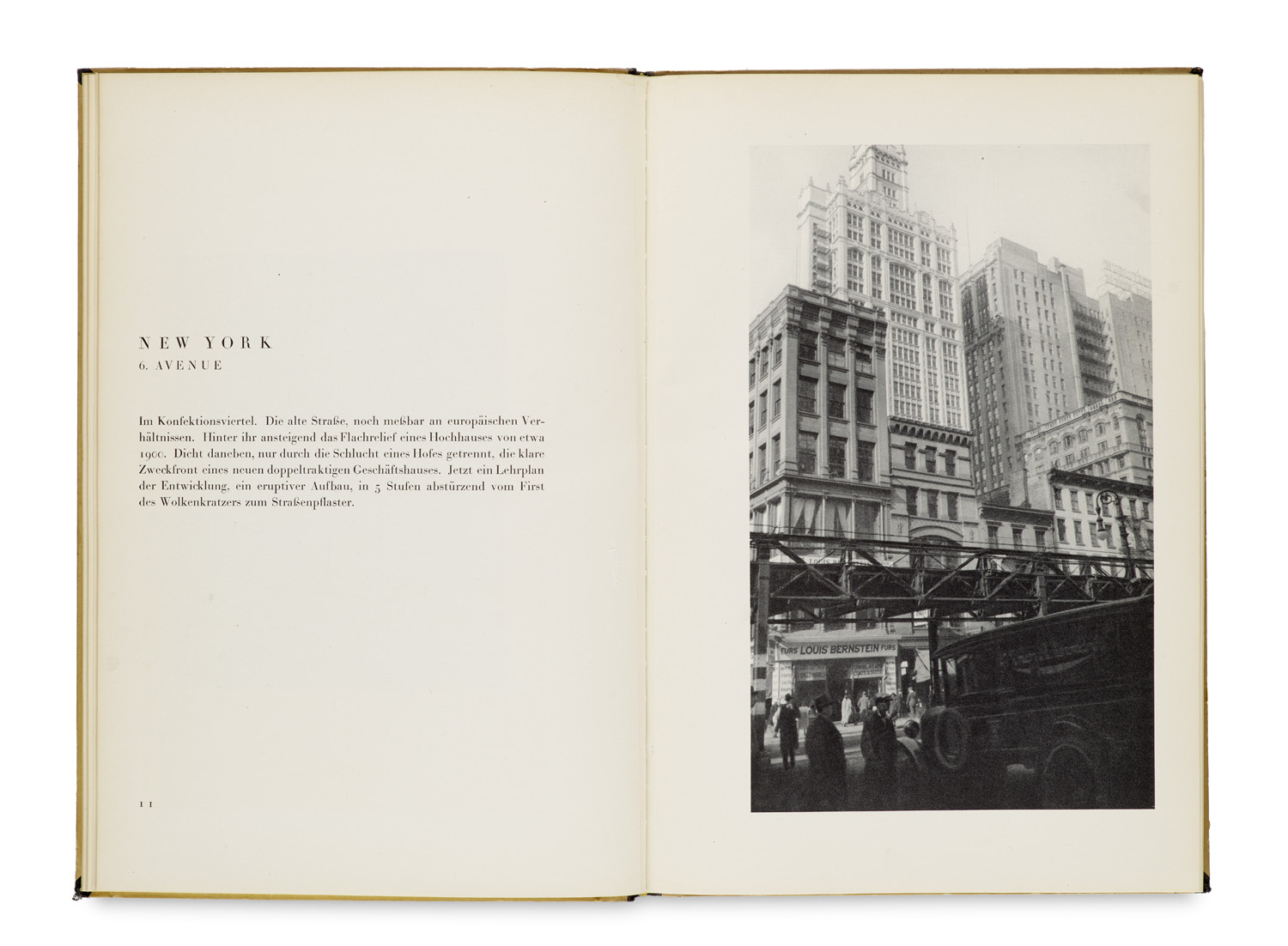 Moderne Literatur und Kunst – Erste Ausgabe. - Parr/Badger 1, S. 76-77 - Jaeger I, S. 174 ff. - Der Architekt führt dem Betrachter sein subjektives Bild von Amerikain Wort und Bild vor Augen, wobei der Titel nicht das Land meint, sonderndas Problem, wie es sich gerade in den Bauten einiger Großstädte manifestiert. Bei den Abbildungen geht es Mendelsohn nicht um dokumentarische Darstellung von Gebäuden, sondern um eine persönliche, individuelle Wahrnehmungund Vermittlung von Architektur innerhal ihres urbanen Gefüges, zu dem hier nicht nur Fassaden, sondern auch Feuerleitern, Werbetafeln und Getreidesilos gehören. Seine Aufnahmen bieten kühne Ansichten aus der Frosch-Perspektivedes aufblickenden Passanten, Gegenüberstellungen von Tag- und Nachtansichten, motivische Kontraste und extreme Ausschnitte, gestaffelte Bildräume und mehrteilige Sequenzen (Jäger). - Kleiner Architektenstempel auf Vorsätzen und Vorwort.