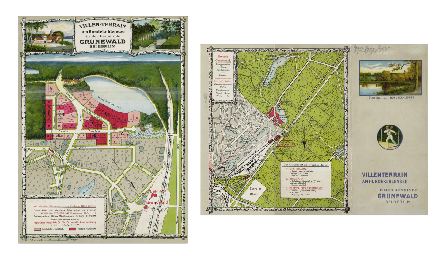 Villenterrain am Hundekehlensee in der Gemeinde Grunewald bei Berlin. Farbig lithographierte, beidseitig bedruckte Faltkarte bzw. Prospekt. Berlin, Meisenbach Riffarth, ca. 1903. 25 x 33 cm.