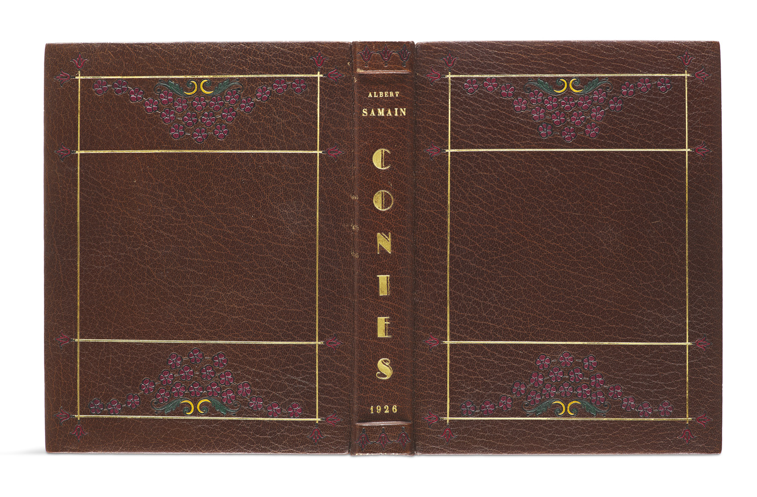 Contes. Xanthis. Divine Bontemps. Hyalis. Rovère et Angisèle. Mit einem signierten Original-Aquarelle, 25 Original Farbradierungen, einer verworfenen Tafel und drei Suiten. Paris, A l'image des trois colombes, 1926. 4°. Dunkelbrauner Maroquin mit goldgepr. RTitel, DFileten, polychromen floralen Intarsien auf Deckeln, Stehkantenvergoldung, dreis. Goldschnitt, polychrome florale Innenspiegel, doppelte Vorsätze aus Moirée-Seide und Marmorpapier (vereinzelt unscheinbar berieben). In gefüttertem HMaroquin-Schuber. Signiert: Max Fonsèque.