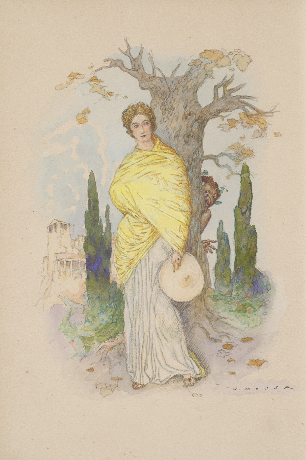 Modern Literature and Art – With one original watercolour drawing, 5 full-page coloured plates, numerous coloured vignettes and book decorations and 4 extra suites with coloured graphics and remarques on various papers. Yellow morocco binding with graduated gilt-stamped fillets, corner fleurons with inlaid black leather, gilt Spinetitles, inner covers with handmade marbled paper, gilt inside and standing edges. Signed: E. Buer Not in Monod. - One of 50 copies of the special edition on Japan with the watercolour and the extra suites. Albert Victor Samain (1858-1900) was a French lyricist and exponent of Symbolism. The beautiful illustrations on Japan by Mossa were hand-coloured by Eugène Charpentier. - Fine hand bound Art Deco binding. Well preserved.