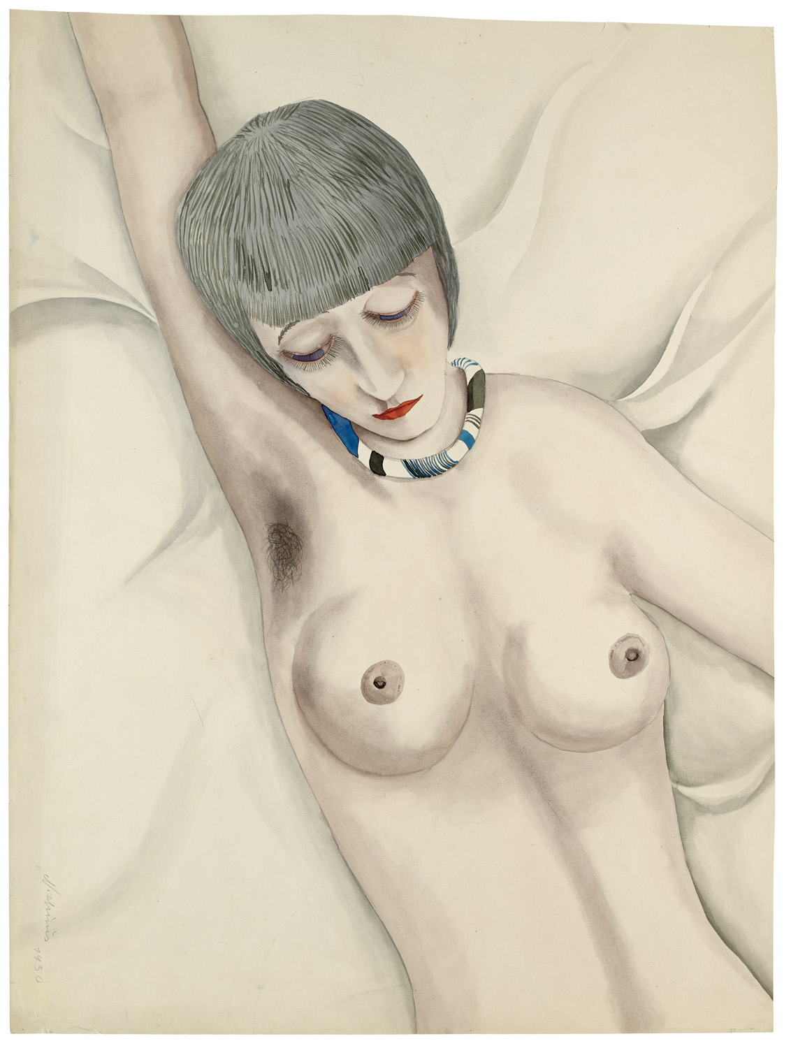 Liegender, weiblicher Akt. Berlin, 1930. Aquarell auf Velin. 47,5 x 63,5 cm. Signiert und datiert, verso mit Vermerk. - An den Rändern mit dezenten Reiß- und Knickspuren, sowie im unteren Bereich mit einer horizontalen Knickfalte, verso atelierspurig und mit leichten Spuren ehemaliger Montierung. Insgesamt sehr gut. In frischem Kolorit gehaltene Komposition.