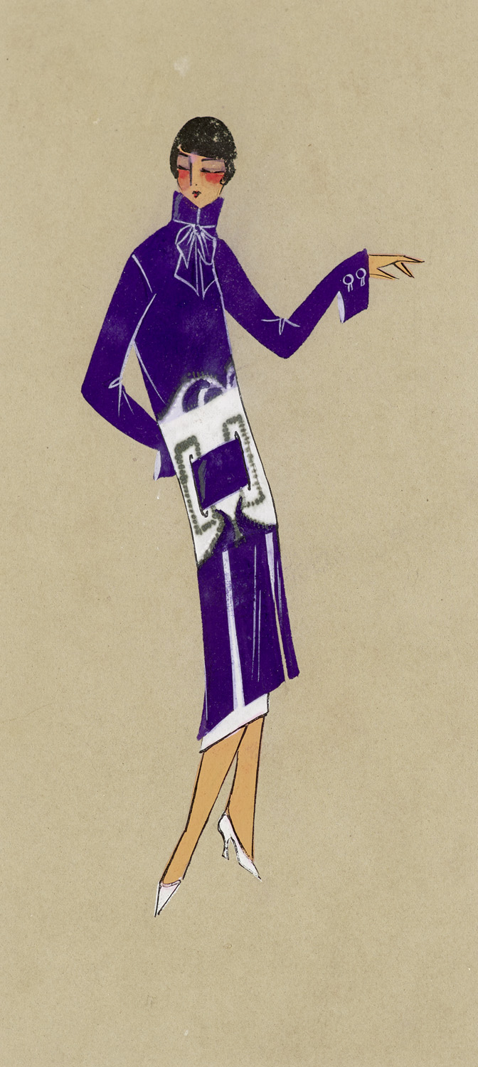 Sammlung von 23 Originalzeichnungen mit eleganten Figuren in typischer Flapper-Mode mit geometrischen Mustern und kräftigen Farben wie Grün, Violett, Gelb und Blau.. Je Gouache meist auf Canson-Papier. Je ca 31,3 x 16,8 cm. In Passepartout montiert. Teils verso mit dem Atelierstempel versehen. Paris, um 1925-30.
