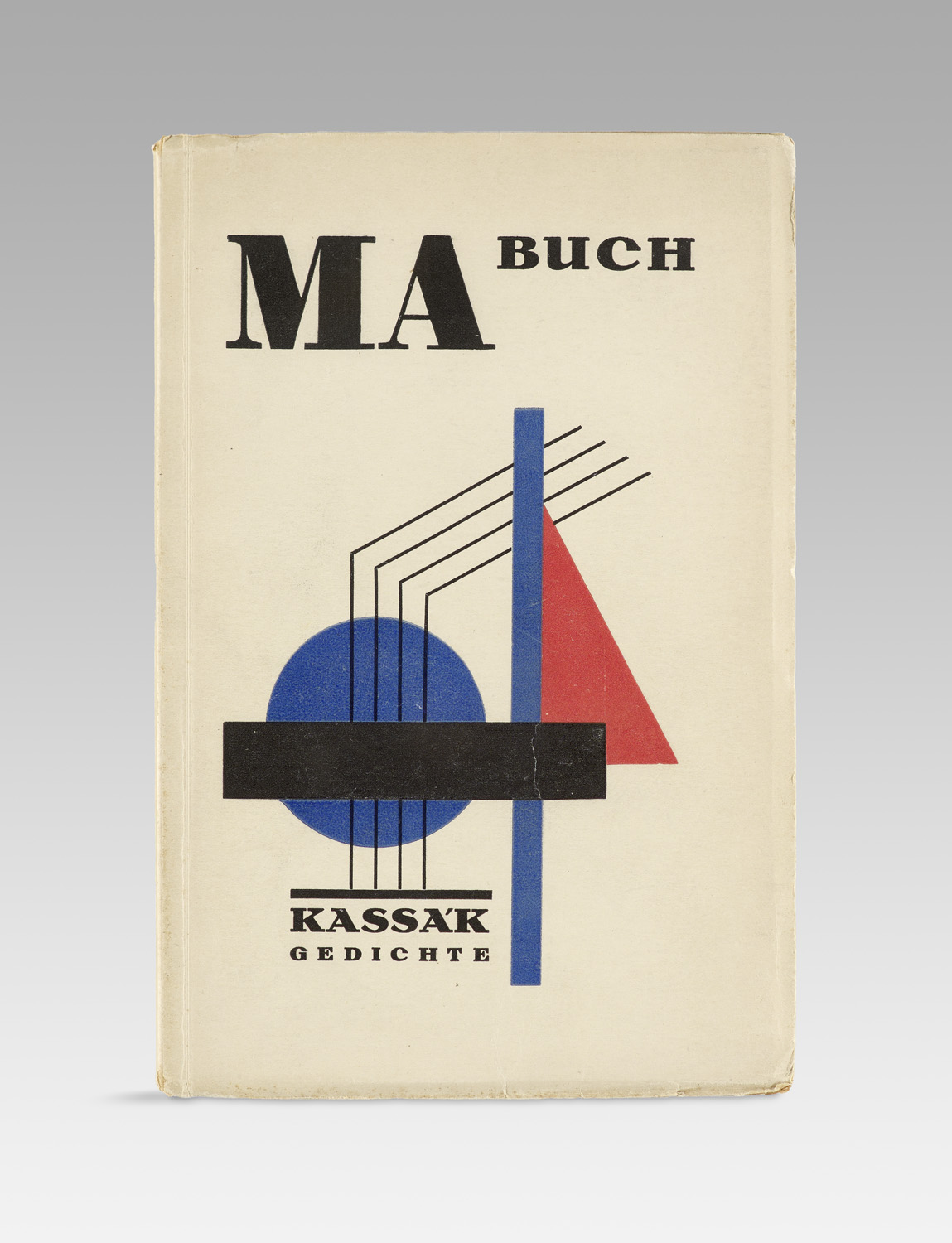 MA-Buch. Gedichte. Deutsch mit einem Vorwort von Adreas Gaspar. Mit 1 teils montierten Farblinolschnitt als Umschlagillustration und 4 blattgroßen Linolschnitten in Schwarz. Berlin, Vlg. Der Sturm (Elbemühl, Wien), 1923. 62 (2, Druckverm.) S. Farbig illustrierte OBr. (an den Ecken und Kanten minimal bestoßen, die überstehenden Kanten stw. mit kaum sichtbaren Stockfleckchen, die Innenkanten des hinteren Umschl. minimal verfärbt).