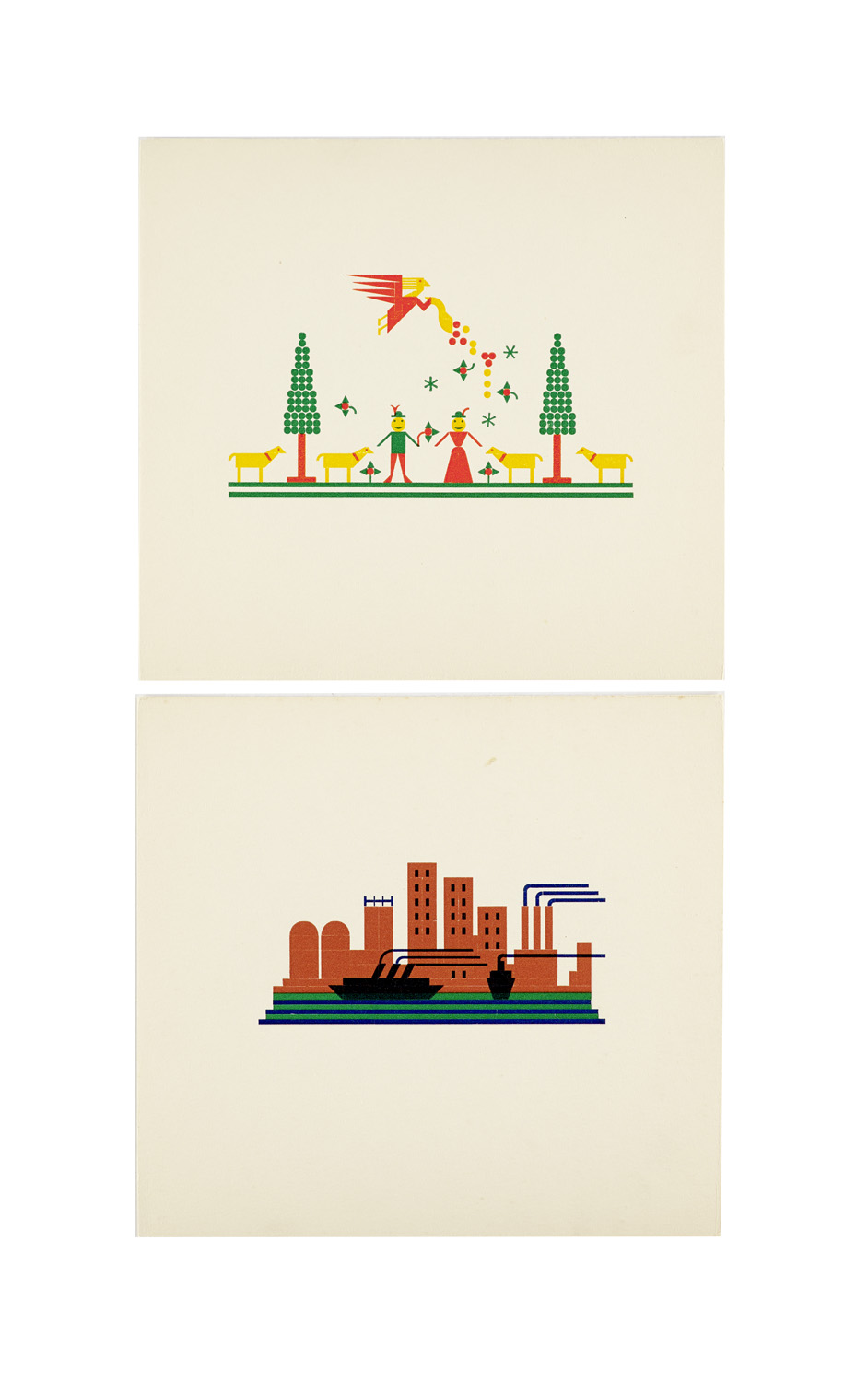 Moderne Literatur und Kunst – Eins von 110 händisch nummerierten Exemplaren, vom Künstler signiert und datiert. - Seltene Illustrationsfolge im Stil des Bauhauses, bestehend aus mittels geometrischen Elementen mehrfarbig "gesetzten", teils piktogrammatisch wirkenden Bildkompositionen. Die Bilder mit Szenen aus dem Alten Testament (Adam und Eva u.a.), mit Pflanzen und Tieren, aus Landwirtschaft, Verkehr und Industrie. Die Drucke kräftig und in satten Farben, Titel, Tafelverzeichnis und Druckvermerk in Rot und Blau gedruckt. - Der Leipziger Hellmuth Weissenborn (1898-1982) ist vor allem als Illusrator von Kinderbüchern und Pressendrucker in England (Acorn Press), wohin er 1938 emigrierte tätig war, ein Begriff. - Die Blätter durchgehend gering gebräunt, sonst wohlerhaltenes Exemplar des modernistischen Bilderbuchs. -