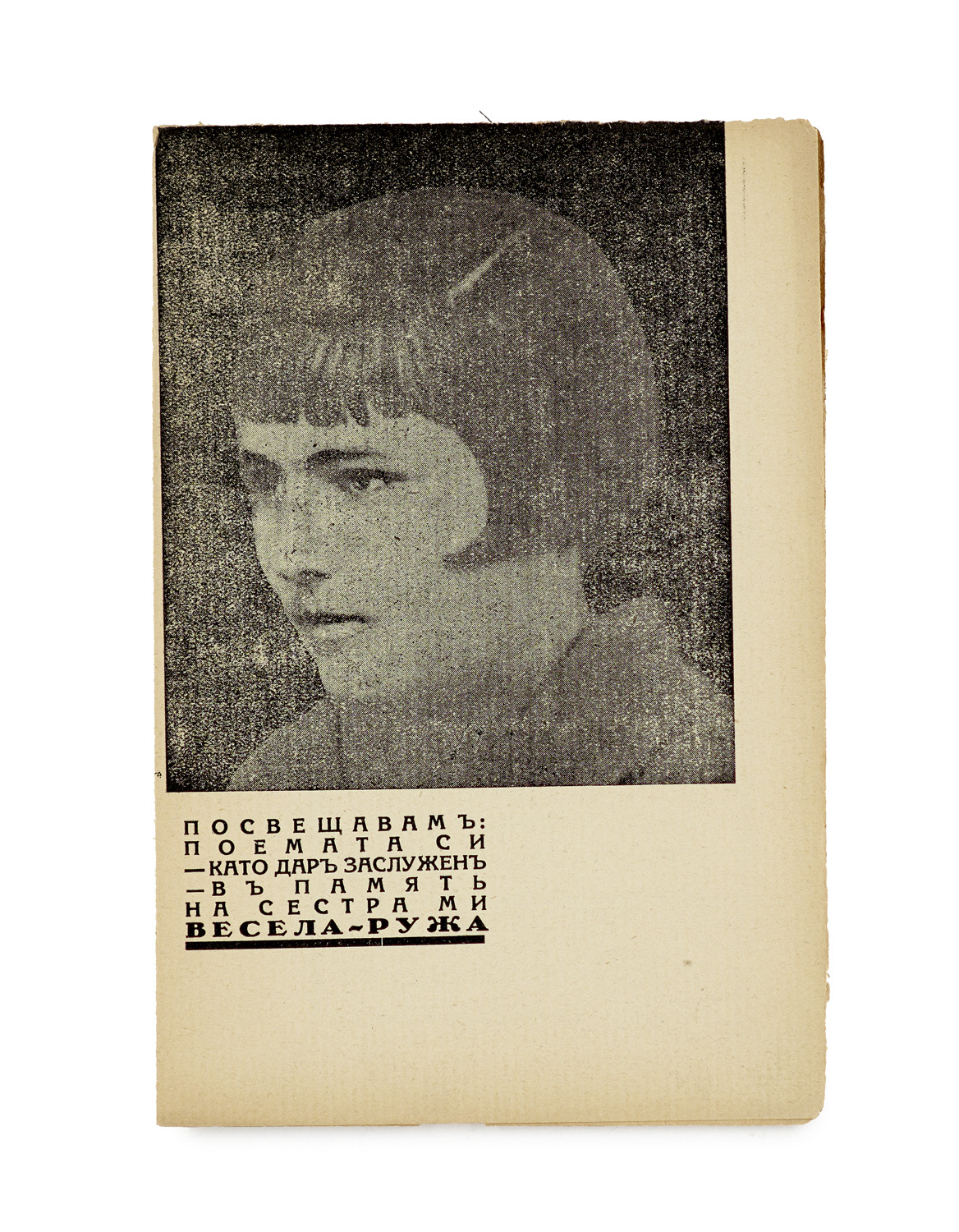 Modern Literature and Art – First edition of this exceptionally designed volume of Bulgarian avant-garde poetry, cover and text strikingly designed with wood-cuts by Khristo Bagrov. - For references see above. - A visually stunning edition, and simultaneously the first book publication of the renowned poet, prose writer, and editor Lyubomir Doychev (1909-91). Doychev spent his youth in Yambol, which in the 1920s was a center of activity for the Futurist-influenced group around Kiril Krastev and the publishing location of the magazine "Crescendo" (1923/24). In 1932, Doychev published the journal "Stozher" in Sofia, which, alongside the periodicals "Novis" and "Ugari," was the most progressive, and primarily Constructivist-oriented, periodical of the second wave of Bulgarian modernism in the early 1930s. - The elaborate and impressive design of this small volume is by Khristo Bagrov, who also provided illustrations for "Stozher." It is particularly noteworthy that each individual page has a different typographic layout, largely illustrated by wood-cuts. In addition to geometric design elements typical of constructivist aesthetics, there are also expressionistic portraits of Cervantes, Dante, Jesus, Lermontov, and Moses, as well as photographs of the author, the designer, and the author's deceased sister, to whom this book, along with a lyrical "Requiem," is dedicated. - Paper browned, otherwise a well-preserved copy. - Of great rarity. We have only been able to trace a copy in the Bulgarian National Library in Sofia and the H. & H. R. collection. According to OCLC/WorldCat and KVK no other copy worldwide.