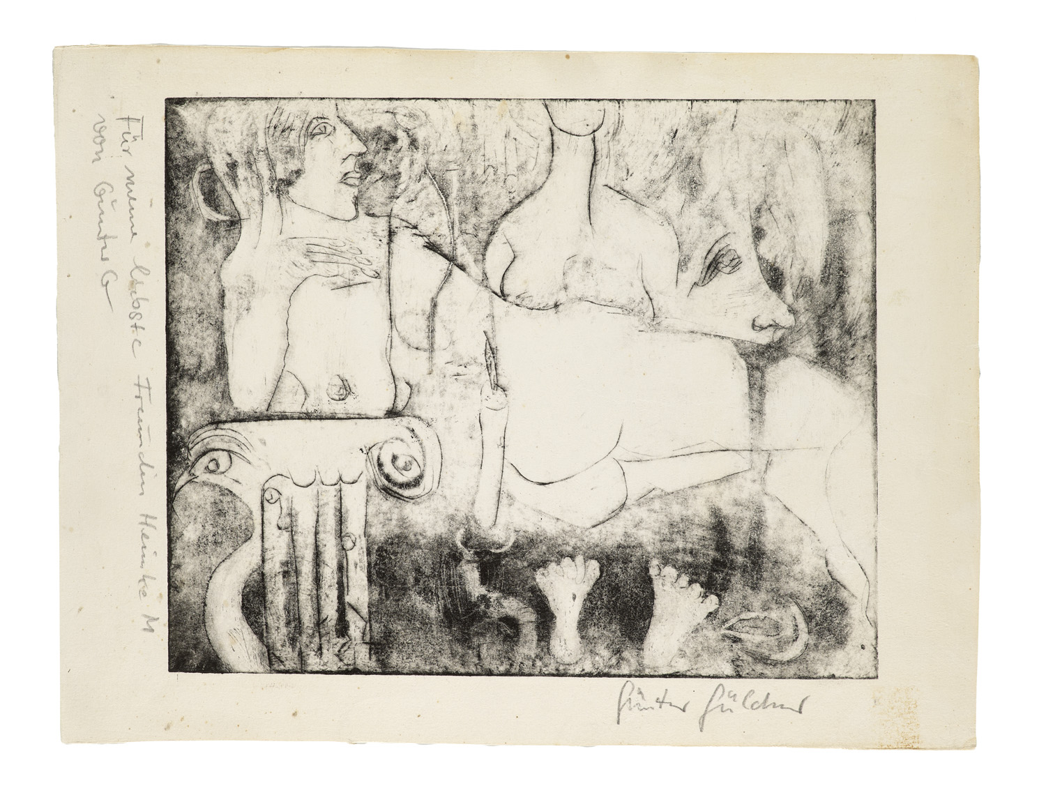 Modern Literature and Art – Folder containern 7 blind-printed and etched prints by Reinhold Bräuer accompanying texts by Günter Güldner, as well as an additional original print by Günter Güldner. Loose in canvas folder (rubbed and bumped, stained). - One of 100 numbered copies, each signed by Reinhold Bräuer. - The original print by Günter Güldner is signed and dedicated to his girlfriend Heimke M. - Edges slightly browned. Güldner's print has minimal foxing. Overall in good condition.