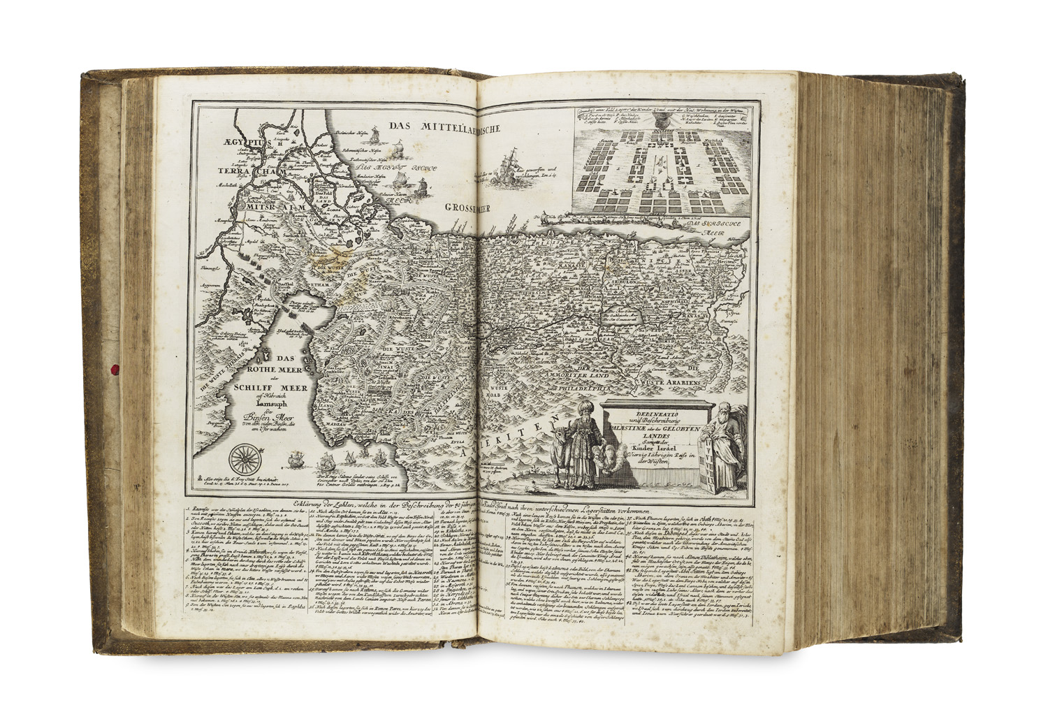Theologie und Religionswissenschaften – Die Cotta'sche Foliobibel erschien in zahlreichen Variaten mit variierender Anzahl der Kupfer. VD18 13901672. - Darlow-Moule 4231 - Strohm E 1255. - Vorliegend wie häufig ohne das Frontispiz-Porträts Pfaffs. Der Jerusalem-Grundriß quer durchgerissen, mit Randläsuren, 1. Frontispiz mit Randfehlstellen und hinterlegten Einrissen, gelegentlich in den Rändern leicht wasserrandig. Insgesamt aber gutes Exemplar.