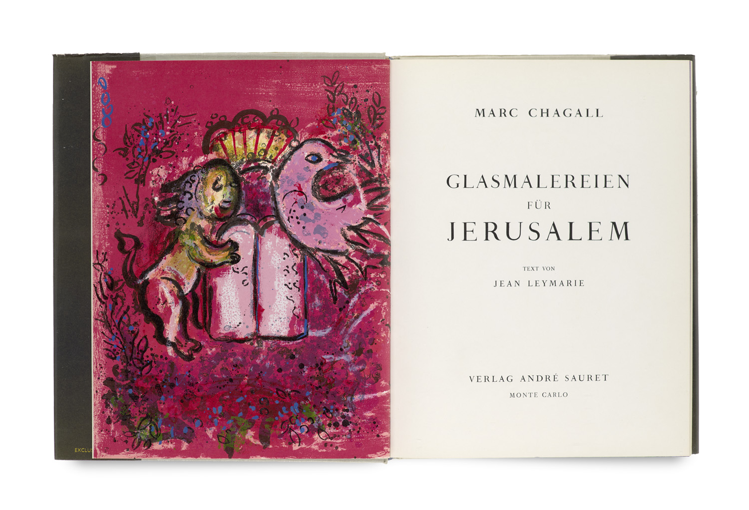 Glasmalereien für Jerusalem. Text von Jean Leymarie. Mit 2 Original Lithographien von Chagall. Monte Carlo, André Sauret, 1962. 211 S., 2 Bll. 4°. Lwd. mit illustr. OUmschlag (leicht bestoßen).
