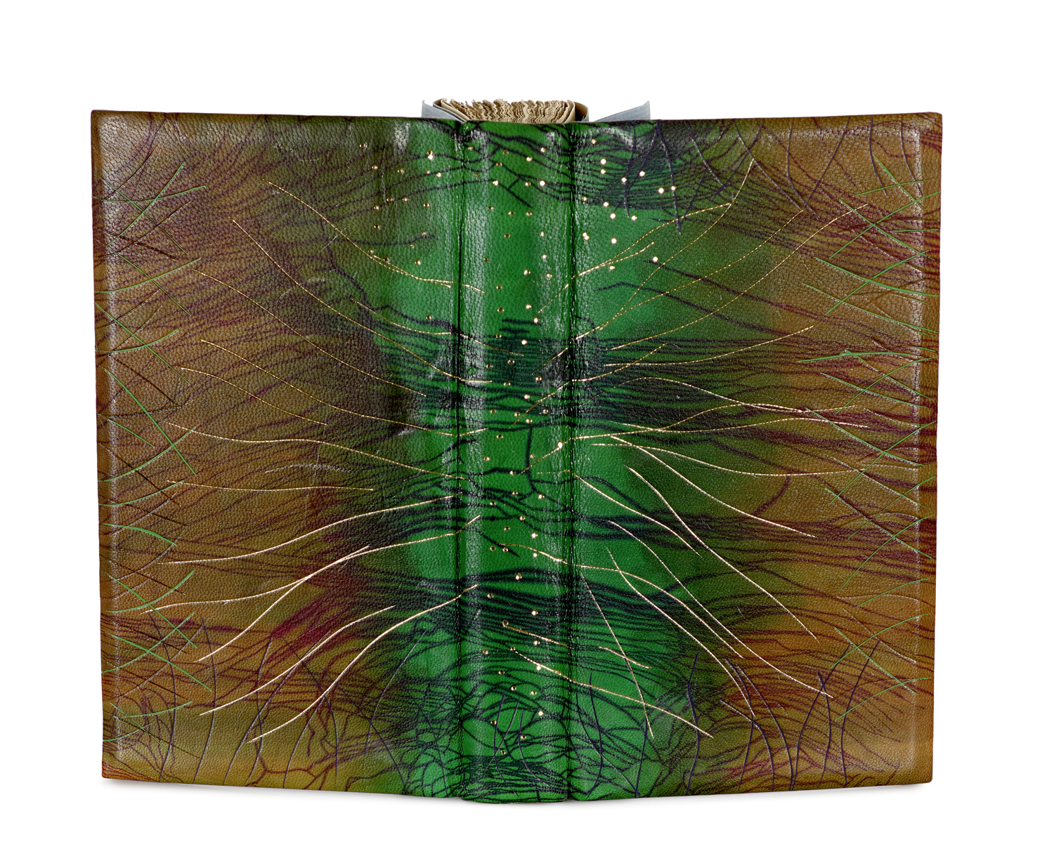 Prachtvoller zeitgenössischer Craquelé Einband in Pasten-Resist Technik in leuchtenden changierenden Grün-Schwarz und Braun- und Dunkelrotönen mit längsverlaufenden teils geschwungene goldgeprägten Linien und Punkten von Dave Clark, Highland Binder. 8° In gefütterter Buchkasette aus Leinen mit Goldprägung.