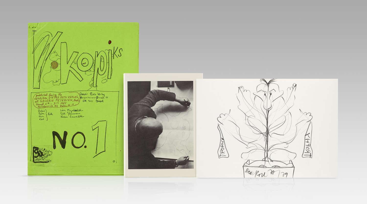 Moderne Literatur und Kunst – Eins von 200 Exemplaren der "englischen" Ausgabe mit einer signierten und nummerierten doppelblattgroßen "original Trophy" (Bleistiftzeichnung). - Döbke 90. - Die von Dieter Roth beidhändig ausgeführten Schnellzeichnungen entstanden 1978. - Tadelloses Exemplar. - Dabei: Ders. Kopiks No. 1. 32 an der oberen linken Ecke geheftete illustr. Bll. (Deckbl. tls. knitterig u. mit kl. Ein- u. Ausriss). - Veröffentlicht während der Ausstellung "Dieter Roth Verlag" in der Galerie Petersen vom 11.-31. März 1985. - Durchgehend mit Abbildungen von Zeichnungen von Dieter Roth und seinen Kindern Bjoern, Vera und Karl Roth.