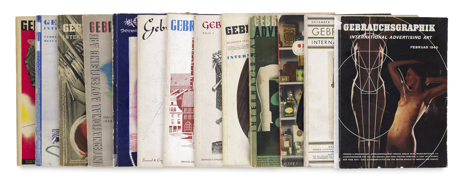Gebrauchsgraphik. Monatsschrift zur Förderung künstlerischer Reklame. Dreizehn Hefte der Jahrgänge 1929-43. Berlin, 1929-43. 4°. Ill. OKart. (etwas bestoßen, teils kleine Läsuren).