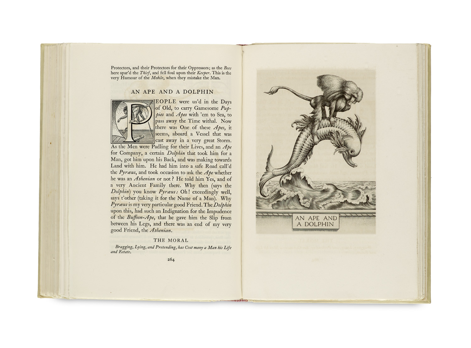 Aesop's Fables translated by Sir Roger l'Estrange Kt. With Plates & Decorations by Stephen Gooden. Mit gestoch. Titel u. 11 gest. Tafeln sowie zahlr. bewohnten Initialen. London, George G. Harrap, 1936. 309 S., 3 Bll. 4°. OPgt. mit Kopfgoldschnitt, goldgepr. RTitel, Goldfileten, goldgepr. Traubenreben als Eckfleurons sowie ein Fuchs als DVignette (Deckel gering aufgebogen), im OPp.-Schuber mit nummer. RSchild (gebräunt, Kanten tls. angeplatzt u. mit Spuren alter Klebebandverstärkung).