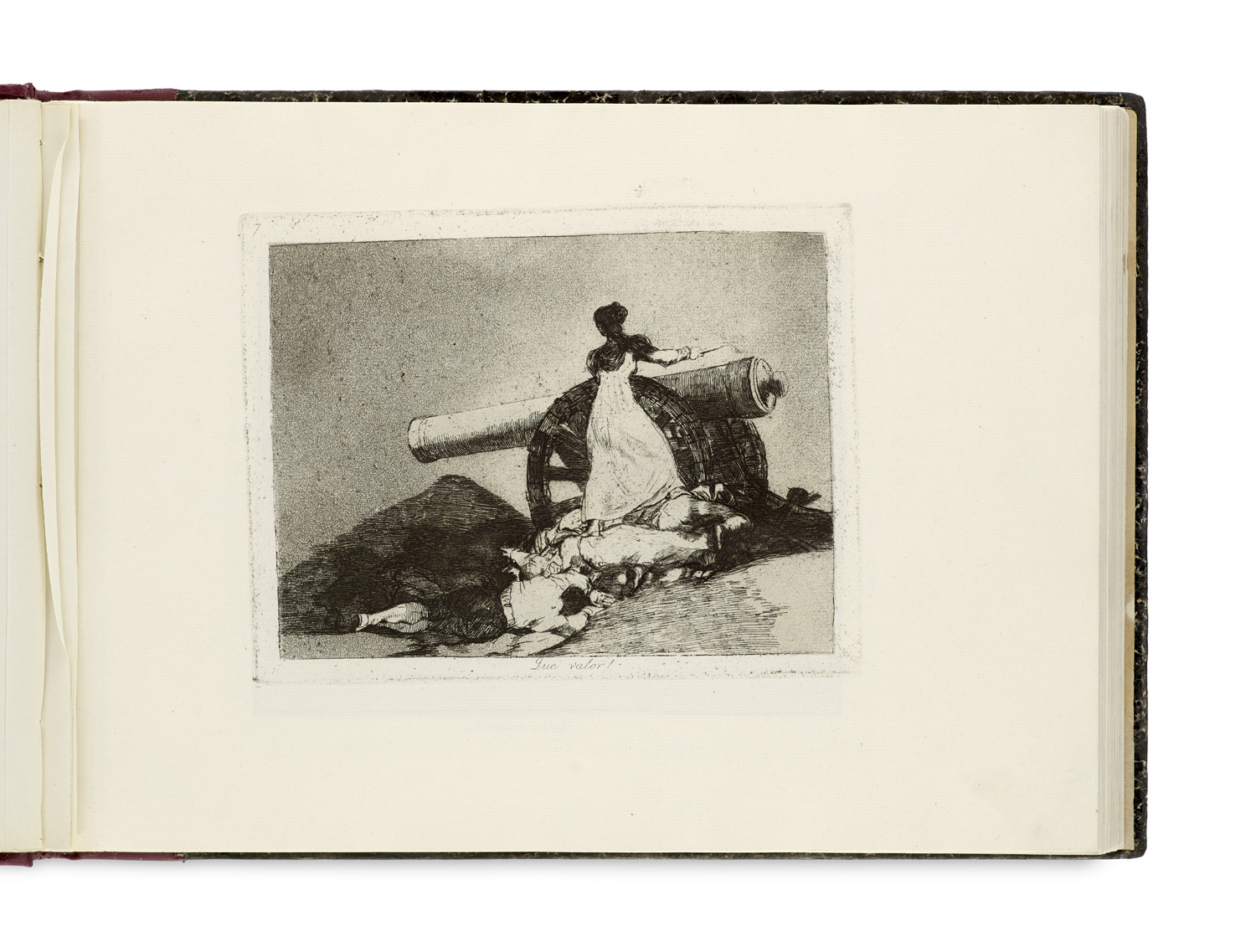 Modern Literature and Art – With 80 etchings using aquatint and wash techniques in black and black-brown on chamois-colored handmade paper. - Los desastres de la guerra (Madrid, 1923) is the fifth edition of Francisco de Goya's (1746-1828) monumental and splendid etching series, which was created between 1810 and 1820 and documents the horrors of the Spanish War of Independence (1808-1814) against Napoleon. This edition was printed by the Calcografía Nacional in Madrid in a limited edition of 100 copies. Goya created the 82 etchings (80 published + 2 unpublished) as an eyewitness in Madrid and Saragossa. Goya's most explosive and most thorough graphic series arose 1810-1814 in the Spanish War of Independence and was intended for a swift publication. Due to Ferdinand VII's repressive policy and the persecution of liberals, Goya refrained from it, instead adding sharp satires against politics and church - with only a delicate glimmer of hope at the end. Political censorship prevented a publication during his lifetime - only two proof copies exist (one for friend Ceán Bermúdez). Son Javier stored the copper plates until 1854. In the year 1862 the Real Academia de San Fernando acquired them and printed 1863 the first edition (500 copies). The fifth state (of 7) is reworked with aquatinta, the margins polished, numbering 1-80 top left. The series is structured into War (Plate 1-47, battles, executions etc.), Famine (Plate 48-64, Madrid 1811/12, dying people) and Allegories (Plate 65-80, oppression, disease, censorship). Goya revolutionized etching: Pure line etching + Aquatinta (for tones), partly watercolor elements. Dramatic contrasts, universal cruelty without heroism - precursor of modern war reporting. Plates like "Grande hazaña! Con muertos!" or "Por una navaja" appear journalistically raw. "Los desastres" is considered Goya's political masterpiece and anti-war manifesto avant la lettre. The edition of 1923 after the 1st World War intensified its universal effect. - The print states of the fifth state present themselves as follows: The contours blur more strongly and the transitions softer. The result is a less aggressively graphic, more painterly-atmospheric velvety plate tone. The impressions have less depth which enhances the planar effect, so that the figures "step forward", backgrounds dissolve. - The etchings professionally rehoused. Overall an excellently cleaned copy with wide margins, the title page with two crease marks. Overall well-preserved edition of this impressive graphic masterpiece.