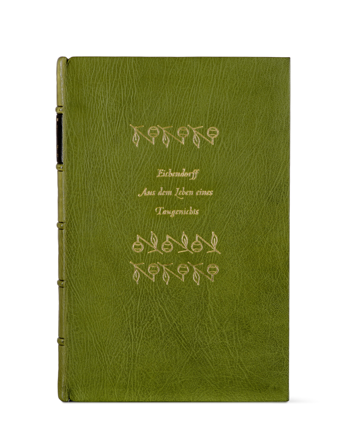 Aus dem Leben eines Taugenichts. Mit 29 Lithographien, fünf davon koloriert blattgroß von Emil Preetorius München, Weber, 1914. 1 Bl., 121 S., 1 Bl. 4°. Handgebd. grüner Maroquinband mit Deckel- u. Rückenverg., Kopfgoldschnitt in Pp.-Schuber mit Lederkanten.