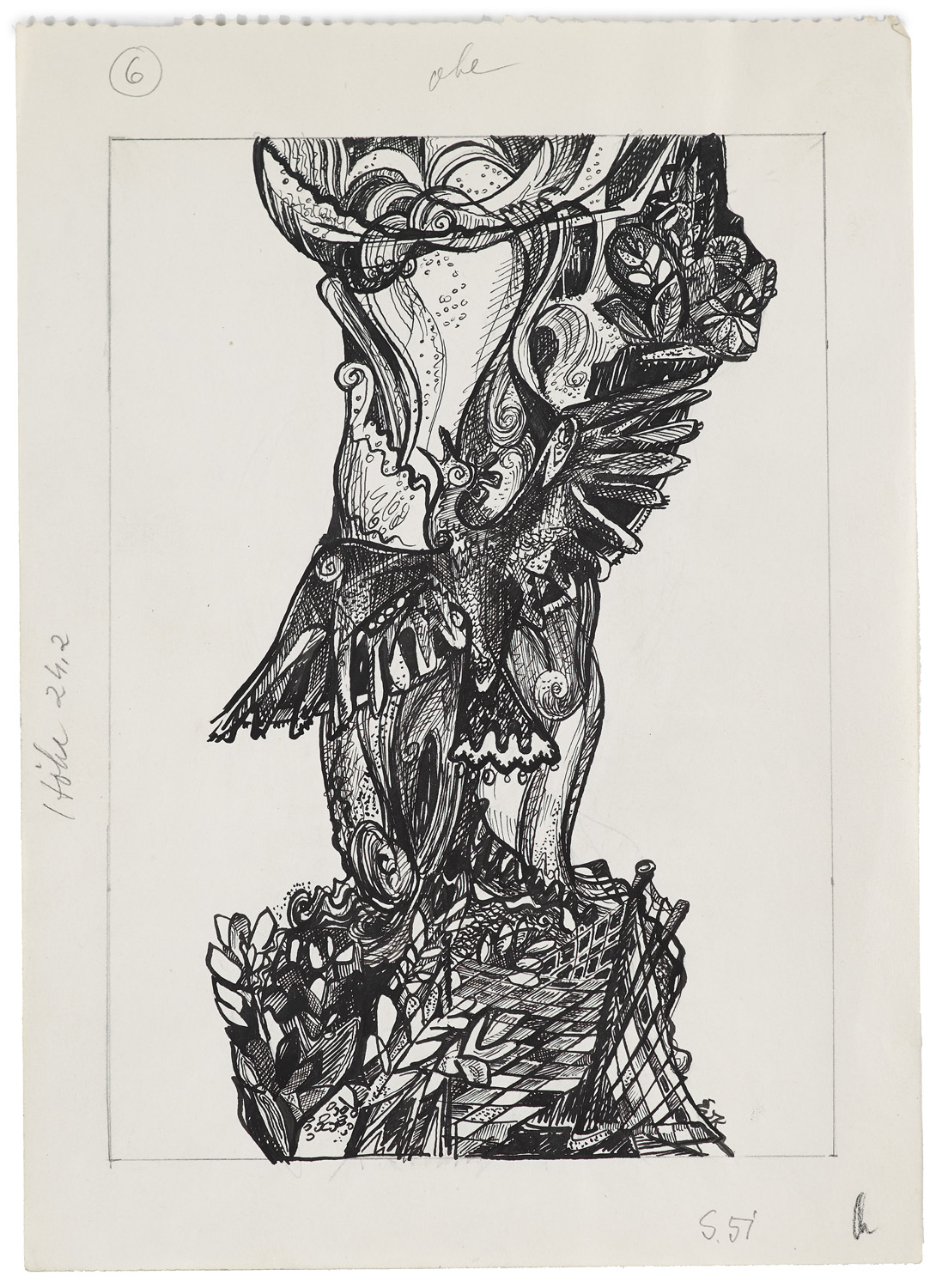 Moderne Literatur und Kunst – Provenienz: - Privatbesitz, Nordrhein-Westfalen. - Direkt aus dem Nachlass des Verlages Karl Rauch erworben. - Die Zeichnungen Ernst Otto Köpkes dienten als Vorlage für die Illustration für Blaise Cendrars "Kleine Negermärchen" von 1960. Es zählt zu den letzten Werken, die Cendrars veröffentlichte bevor er 1961 verstarb. Der Schweizer Dichter und Schriftsteller Cendrars erzählt in 10 Märchen von einem unbekannten, phantastischen Ort und seinen Bewohnern und Tieren wie Krokodilen, Pavianen und Löwen, aber auch Fabelwesen wie sprechenden Bäumen oder Schutzgeistern. Die Protagonisten erleben Abenteuer und müssen Lebensprüfungen bestehen. Ernst Otto Köpkes Illustrationen stellen insofern eine Besonderheit dar, als dass kein anderes Projekt bekannt ist, bei dem der Künstler als Illustrator tätig war und Köpke vor allem für seine Glasmalerei in öffentlichen Bauten und Kirchen bekannt wurde. In detaillierten, sicher ausgeführten Arbeiten mit Feder in tiefschwarzer Tusche erblicken wir exotische Mischwesen zwischen Flora und Fauna. Einflüsse lassen sich von afrikanischen Masken und Körperornamenten erkennen, sodass Köpke vermutlich Typologie und Stilistik der diversen afrikanischen Kunst für seine Illustrationen interpretierte und sich dicht an Text und Handlungsstrang der Geschichte orientierte. Blaise Cendrars Gesamtwerk wurde bis auf eine Ausnahme zuerst vom Verlag Karl Rauch veröffentlich, wo auch "Kleine Negermärchen" 1961 erschien.