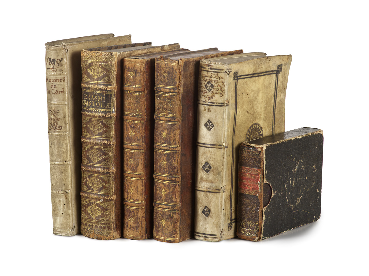 Theologie und Religionswissenschaften – Enthält: Benedikt, Regula Sancti Patris Benedicti. Cum Declarationibus, & Constitutionibus editis a Patribus Congregationis Casinensis ... Ed. Jac. du Breul. Mit wdh. Holzschn.-Titelvign. u. ganzs. Holzschn. Titel versu. 2 Tle. in 1 Bd. Frankfurt, Steinius u. Mainz, Lippium, 1604. Pgt. d. Zt. mit Deckelverzierung (etwas bestoßen). - VD17 547:663854K - Stempel versu Titel, etwas gebräunt.Zinzendorf, N.L.v., Einiger seit 1751 vor dem Ordinario Fratrum in London gehaltenen Predigten. 1. u. 2. Bd. London, 1756-57. Ldr. d. Zt. (beschabt). - Erasmus von Rotterdam, Epistolae Selectiores. Breslau, 1752. Ldr. d. Zt. (etw. beschabt). Ohne Frontispiz. - Antonelli, N., De Titulis Quos S. Evaristus Romanis Presbyteris Distribuit Dissertatio. Mit gest. Titelvign. Rom, 1725. Pgt. d. Zt. - Stempel a. Titel. - Güldenes Schatz-Kästlein der Kinder Gottes. Halle, 1759. Quer-12°. HLdr. d. Zt. im Pp.-Schuber. (beschabt). - Durchschossenes Exemplar mit Notizen von alter Hand.