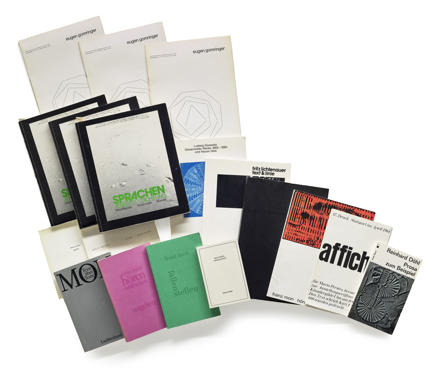 Sammlung von 17 Bänden und Heften in 26 Exemplaren, darunter Ausgaben von Werken von Claus Bremer, Gernot Bubenik, Carlfriedrich Claus, Reinhard Döhl, Pierre Garnier, Eugen Gomringer, Ludwig Gosewitz, Fritz Lichtenauer, Franz Mon und Wolf Wezel, meist in Erstausgabe oder mit Erstdrucken und illustriert, darunter 7 von den Autoren signiert. 1965-1992