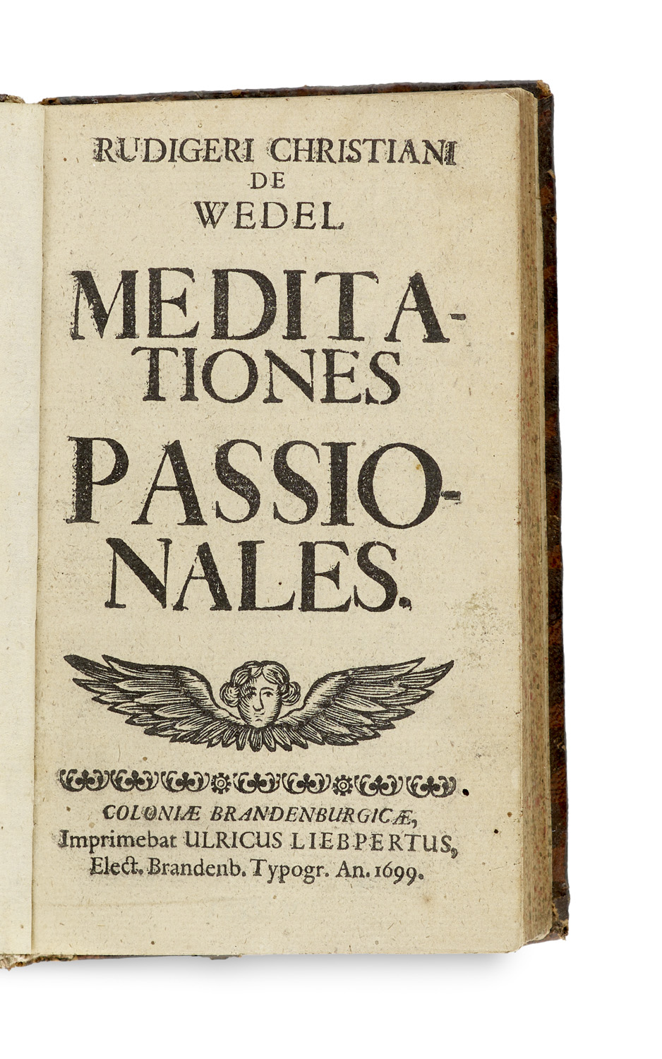 Meditationes Passionales. Mit Holzschnitt-TVignette u. Holzschnitt-Buchschmuck. Coloniae Brandenburgicae, Ulricus Liebpertus, 1699. 8 Bl., 264 S. (ohne Errata-Blatt). Kl.-8°. Ldr. d. Zt. auf 4 Bünden mit Papier-RSchild (oberer Rücken mit Fehlstelle, berieben, bestoßen, untere Kanten tls. beschabt).