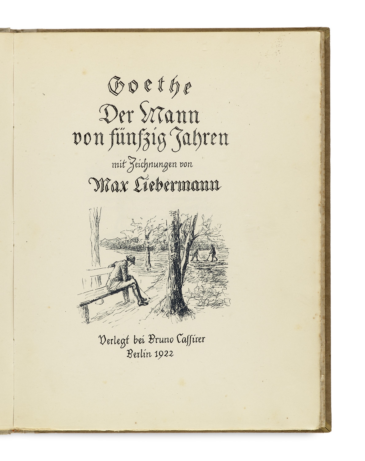 Der Mann von fünfzig Jahren. Mit 36 Original-Holzschnitten von O. Bangemann und M. Hönemann nach Federzeichnungen von Max Liebermann. Berlin, Bruno Cassirer, 1922. 76 S., 2 Bll. 4°. OHPgt. mit Kopfgoldschnitt, goldgepr. RTitel u. geprägter illustr. DVignette (leicht bestoßen, Deckel etw. lcihtrandig).