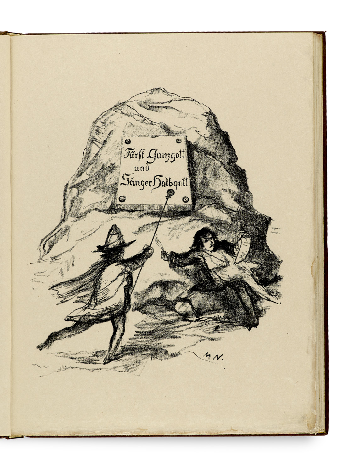 Fürst Ganzgott und Sänger Halbgott. Mit lithogr. Buchschmuck und 20 ganzseitigen Original-Lithographien von Max Neumann. München, 1919. 96 S. Folio. Orig.-Kalbsleder auf 5 Bünden mit goldgeprägtem RTitel, doppelte Goldfileten auf Rücken und Deckel, Steh- und Innenkantenvergoldung und KGoldschnitt (signiert "Spamersche Buchbinderei. Leipzig"). (etwas berieben u. bestossen).